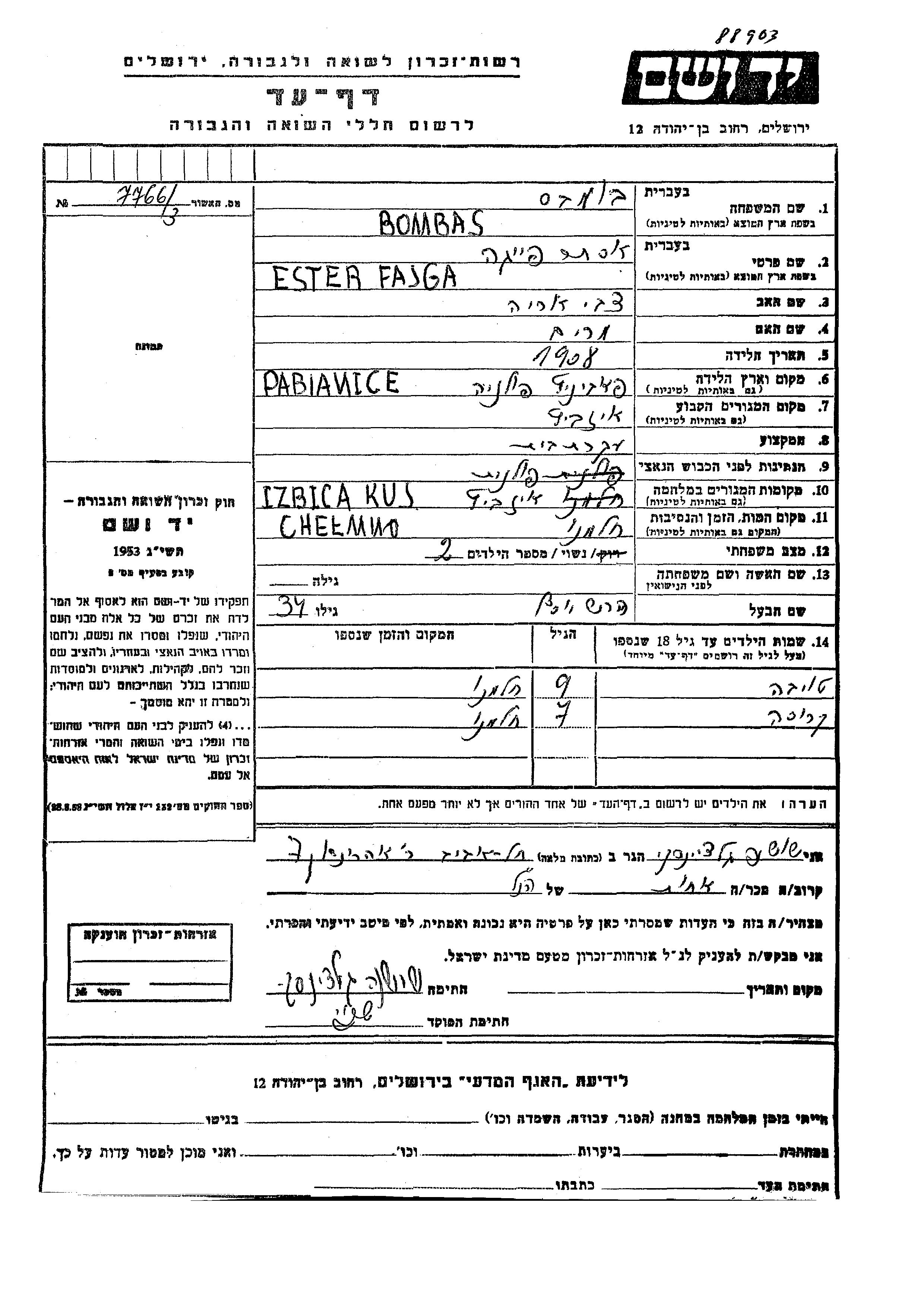 Kreisa Bombas wurde Sie war die Tochter von Hersh Yosef und Fajga Ester, geb. Dareshevitz. Sie war Kind. Vor dem Zweiten Weltkrieg lebte sie in Izbica Kujawska, Polen. Während des Krieges war sie in Izbica Kujawska, Polen.