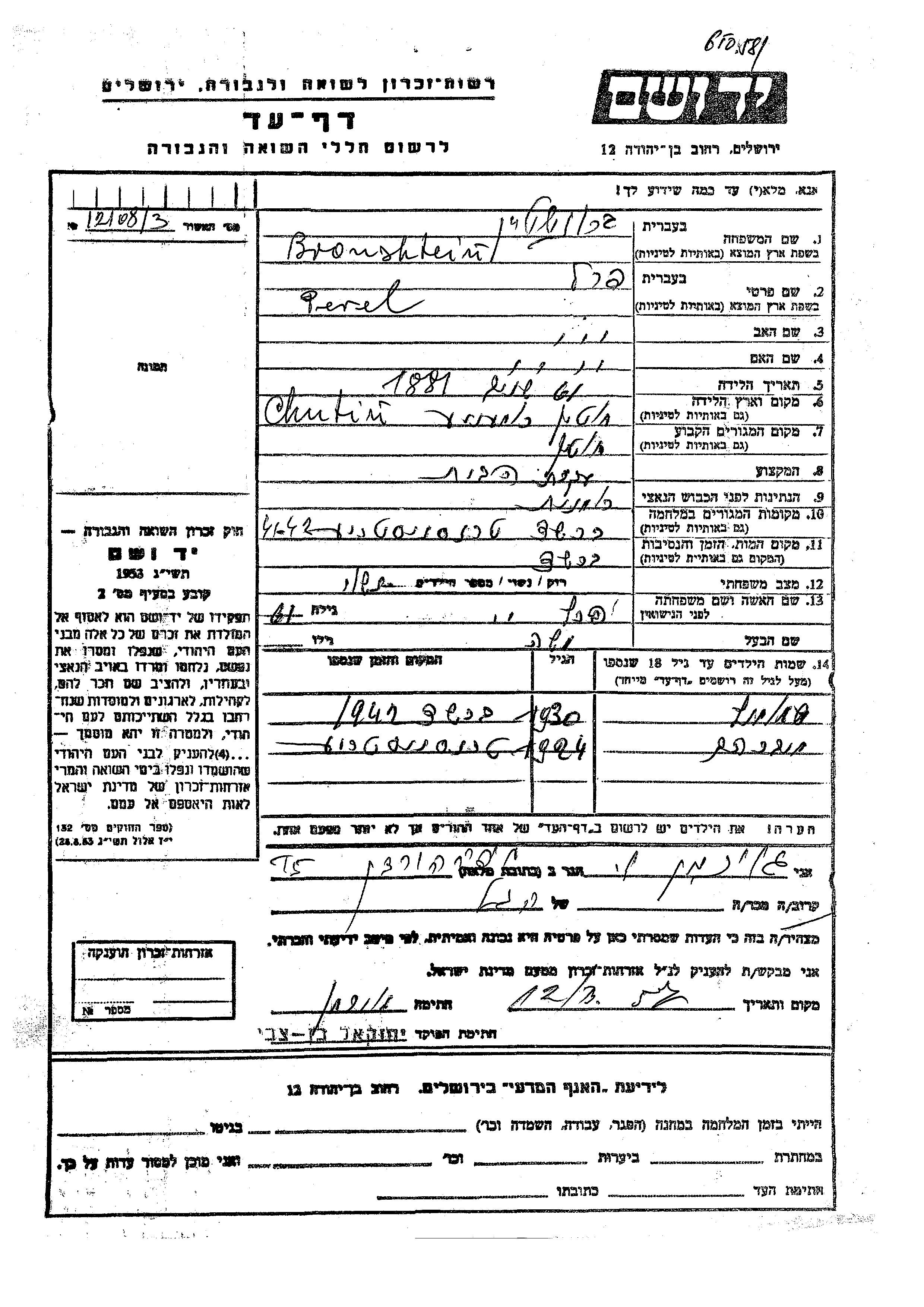 Shmuel Bronshtein wurde im Jahr 1930 geboren. Er war der Sohn von Moshe und Perel, geb. Peretz. Er war Kind. Vor dem Zweiten Weltkrieg lebte er in Chutin, Rumänien. Während des Krieges war er in Bershad, Ukraine (UdSSR).