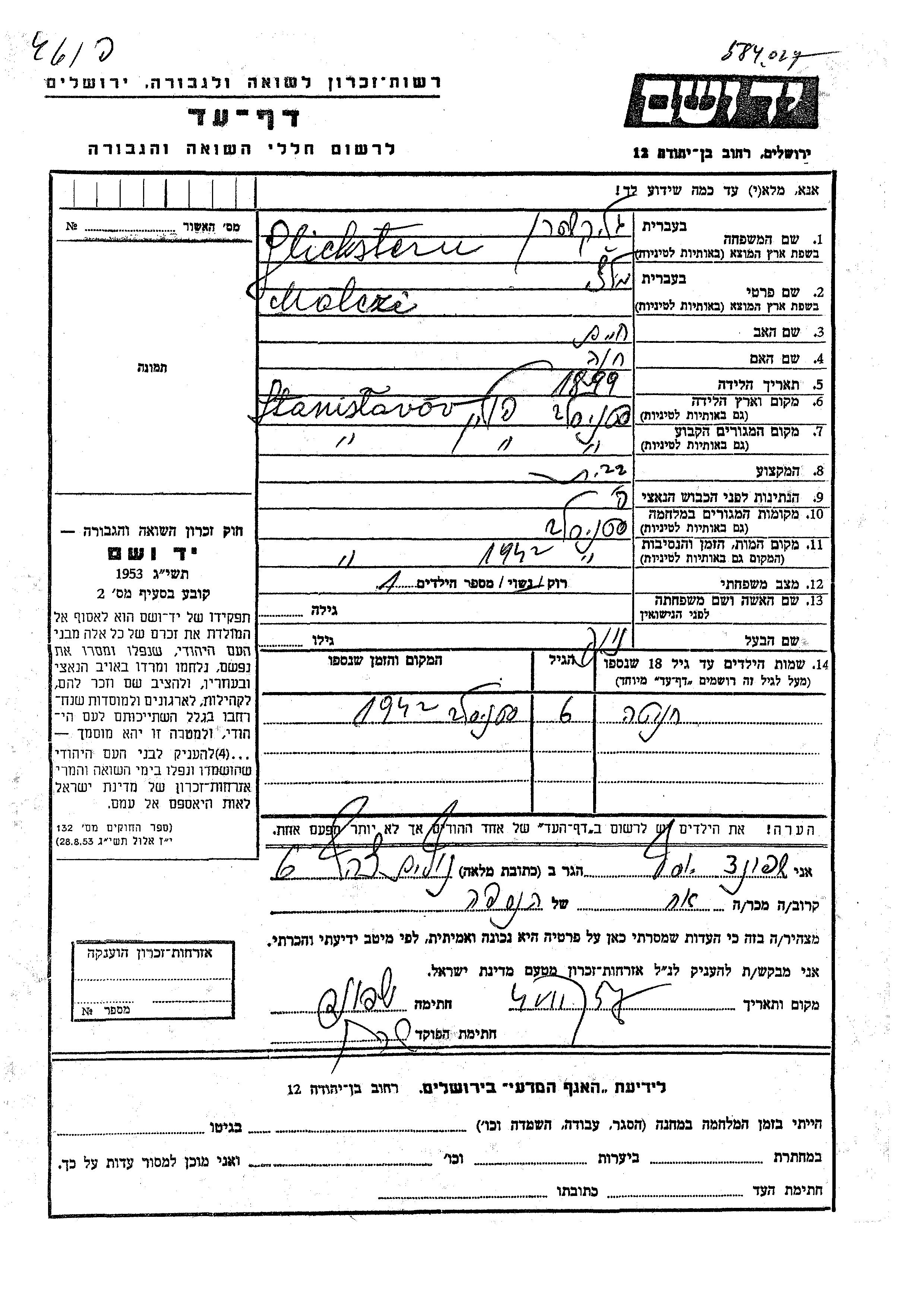 Glickstern Khana Stanislavov, Polen Gedenkblatt