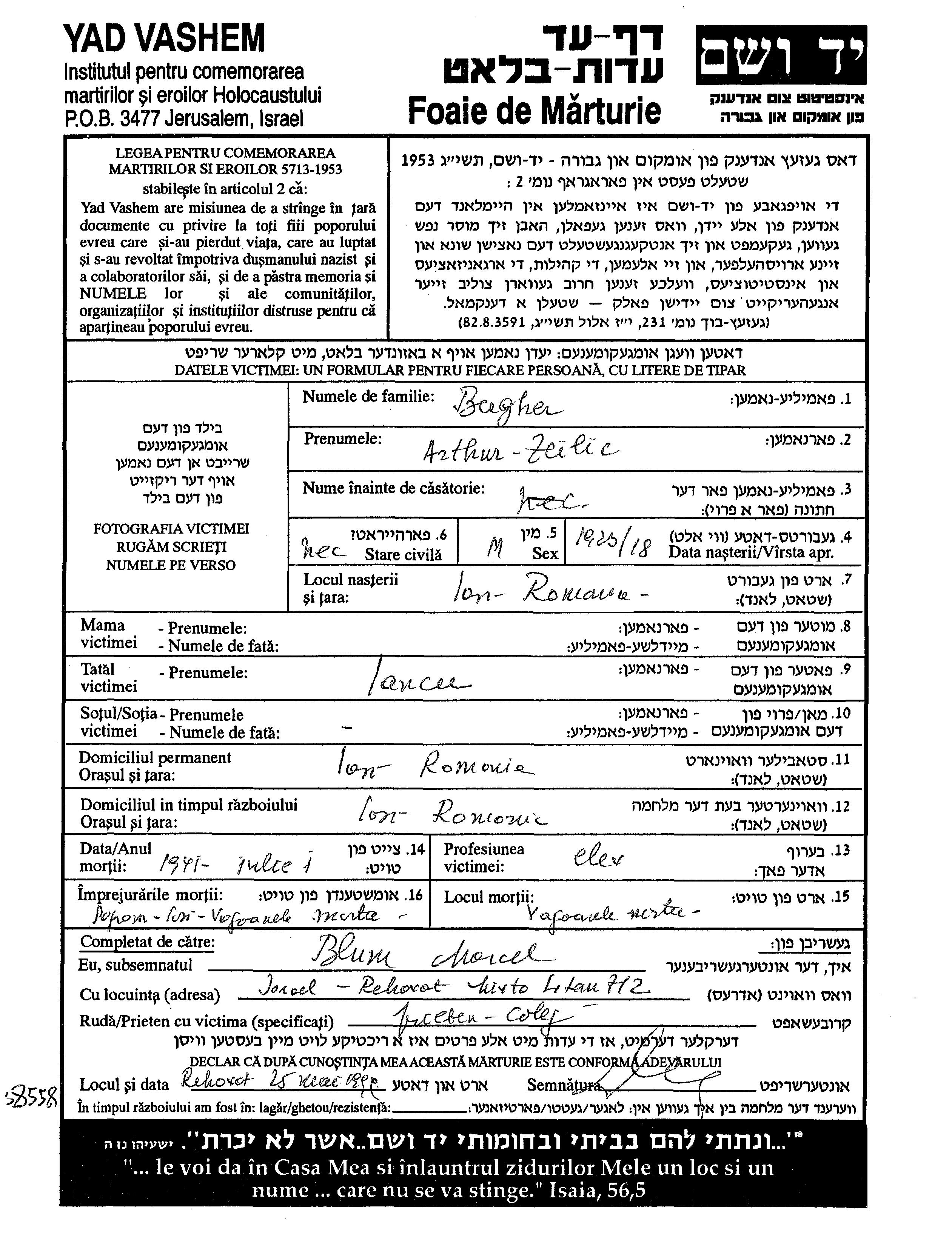 Arthur Zeilic Bergher wurde im Jahr 1923 in Iasi, Rumänien geboren. Er war der Sohn von Iancu. Er war Schüler/-in und Ledig. Vor dem Zweiten Weltkrieg lebte er in Iasi, Rumänien. Während des Krieges war er in Iasi, Rumänien.