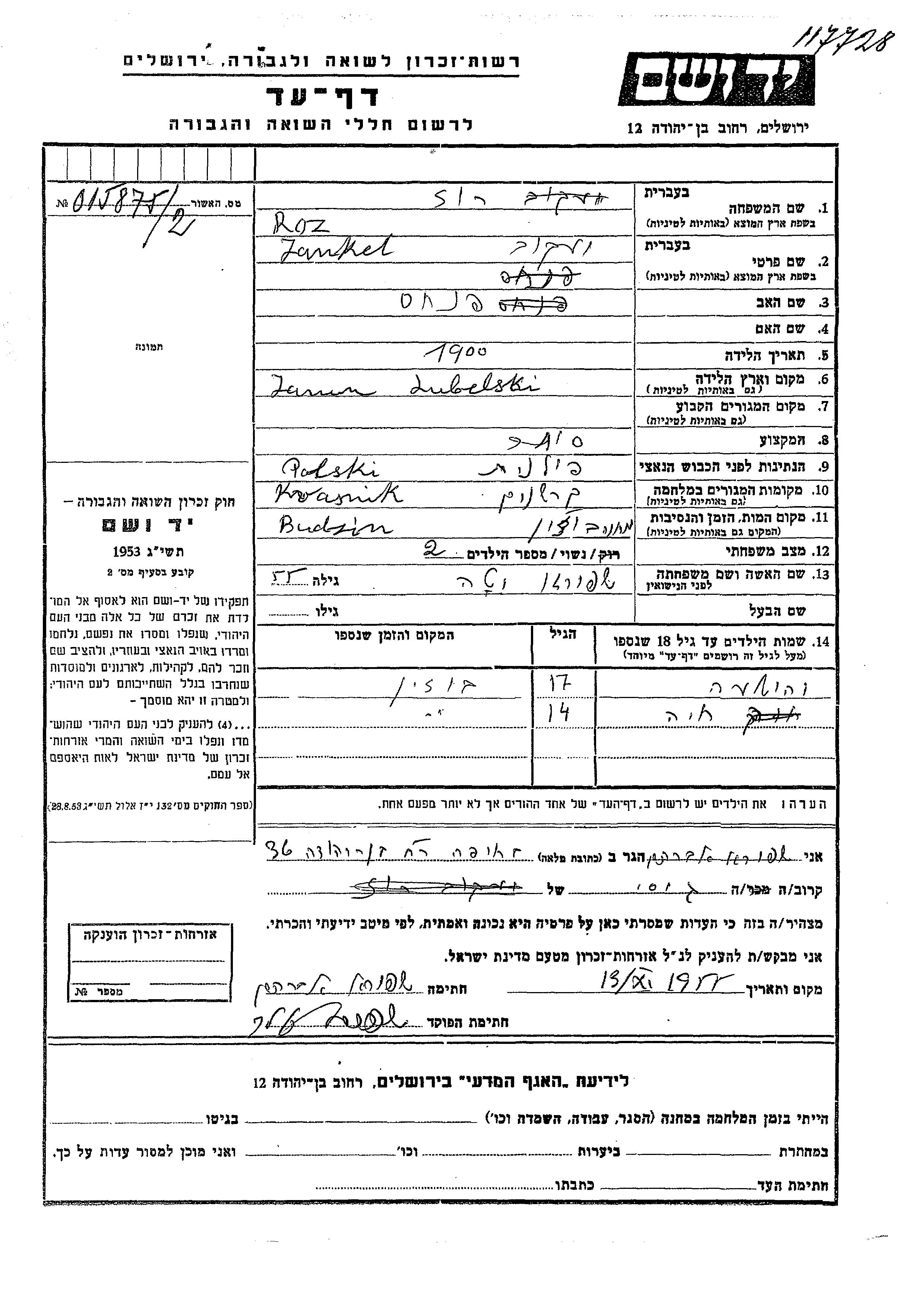 Yehoshua Roz wurde Er war der Sohn von Jankel und Yeta, geb. Shapira. Er war Kind. Während des Krieges war er in Krašnik, Polen.