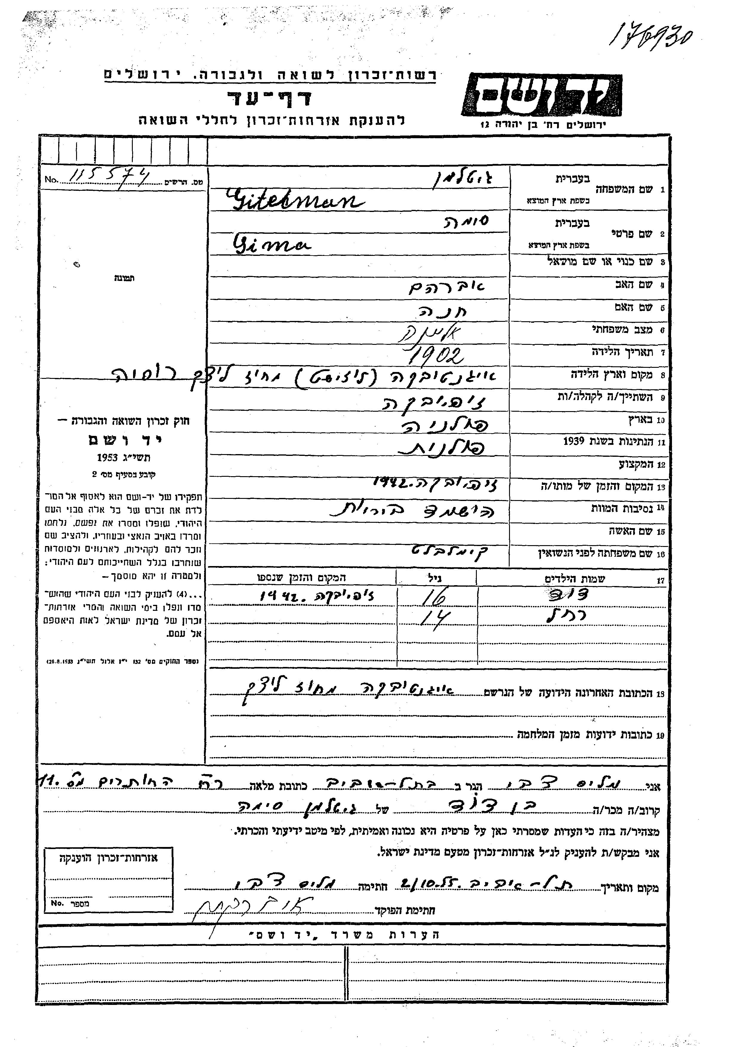 Gitelman David 1942 Ignatowka, Polen Gedenkblatt