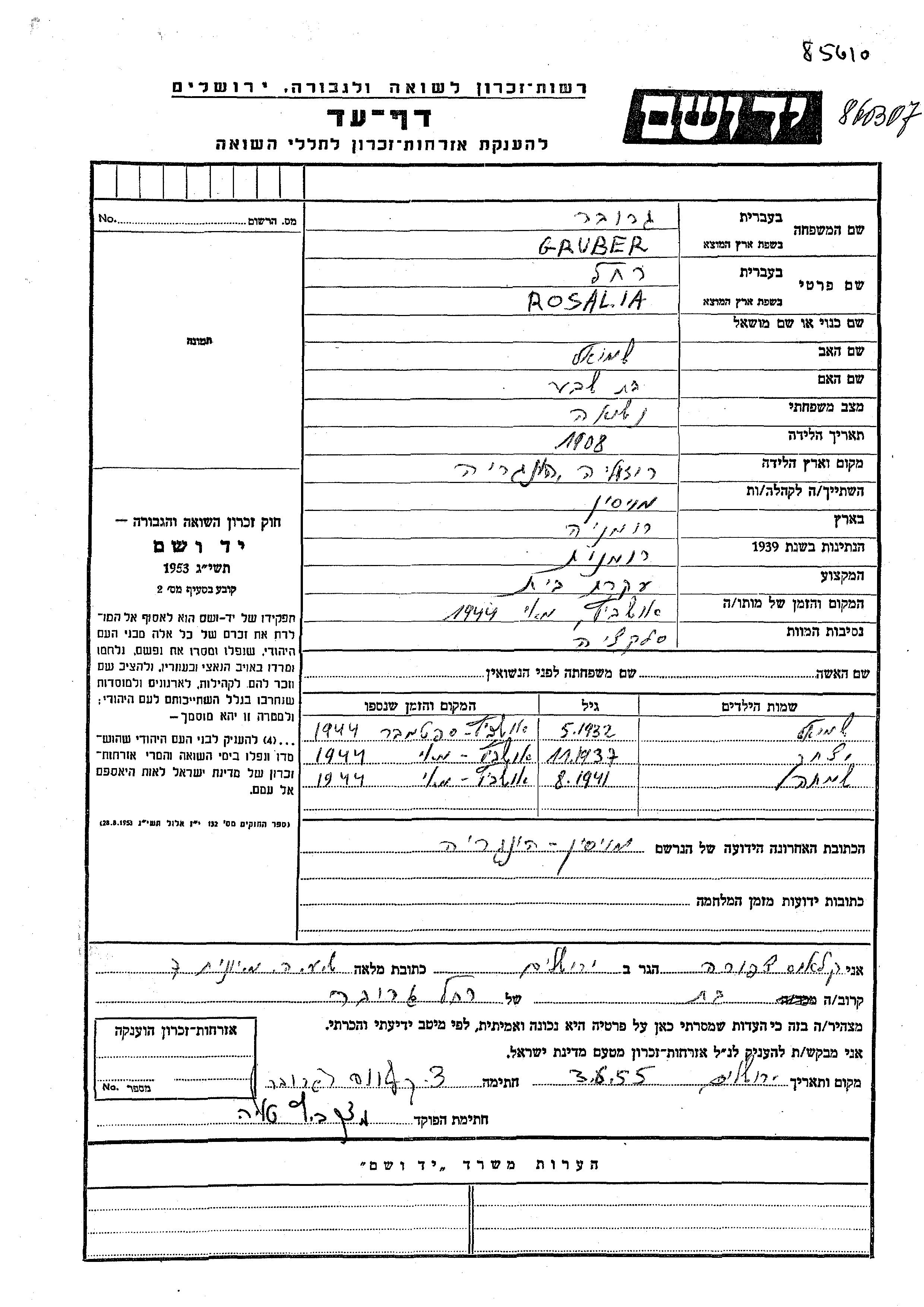 Yitzkhak Gruber wurde Er war der Sohn von Rosalia Rakhel. Er war Kind. Vor dem Zweiten Weltkrieg lebte er in Moisif, Rumänien.