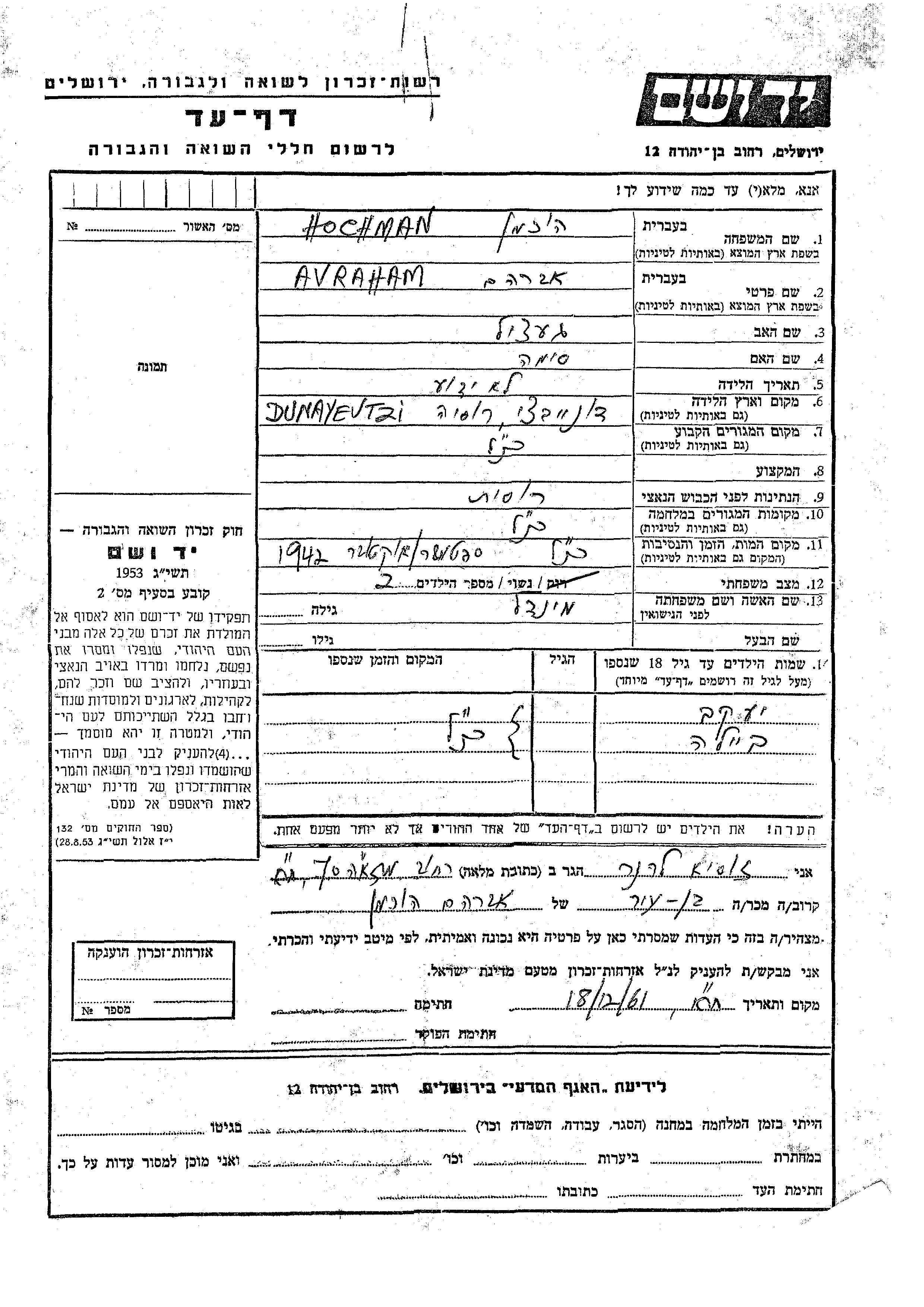 Beila Hochman wurde Er/sie war der/ die Sohn/Tochter von Avraham und Mindl. Er/Sie war Kind. Vor dem Zweiten Weltkrieg er/sie in Dunayevtsy, Ukraine (UdSSR). Während des Krieges war er/sie in Dunayevtsy, Ukraine (UdSSR).