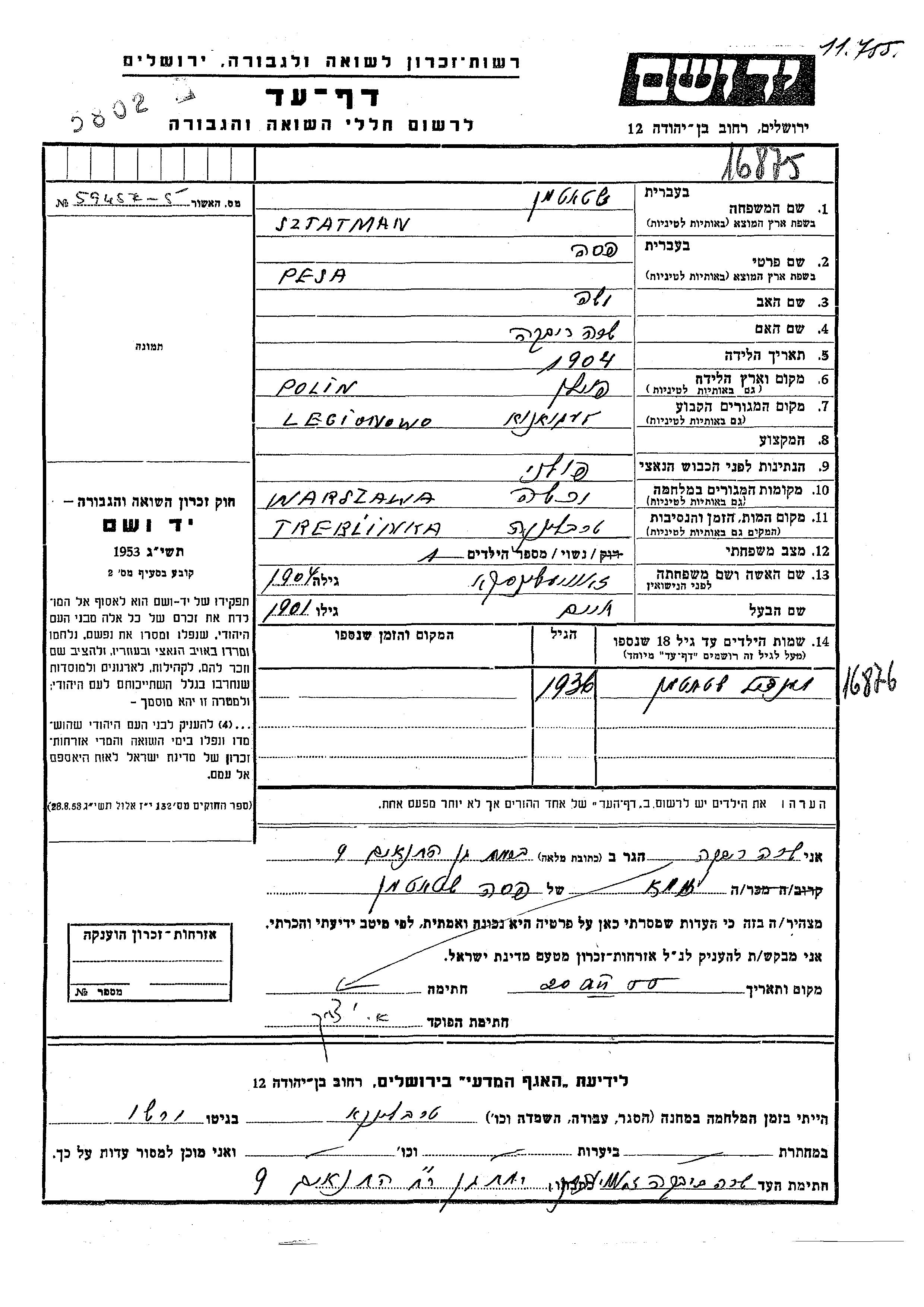 Mendl Sztatman wurde Er war der Sohn von Khaim und Pesa, geb. Zavieshinska. Er war Kind. Vor dem Zweiten Weltkrieg lebte er in Legionowo, Polen. Während des Krieges war er in Warszawa, Polen.