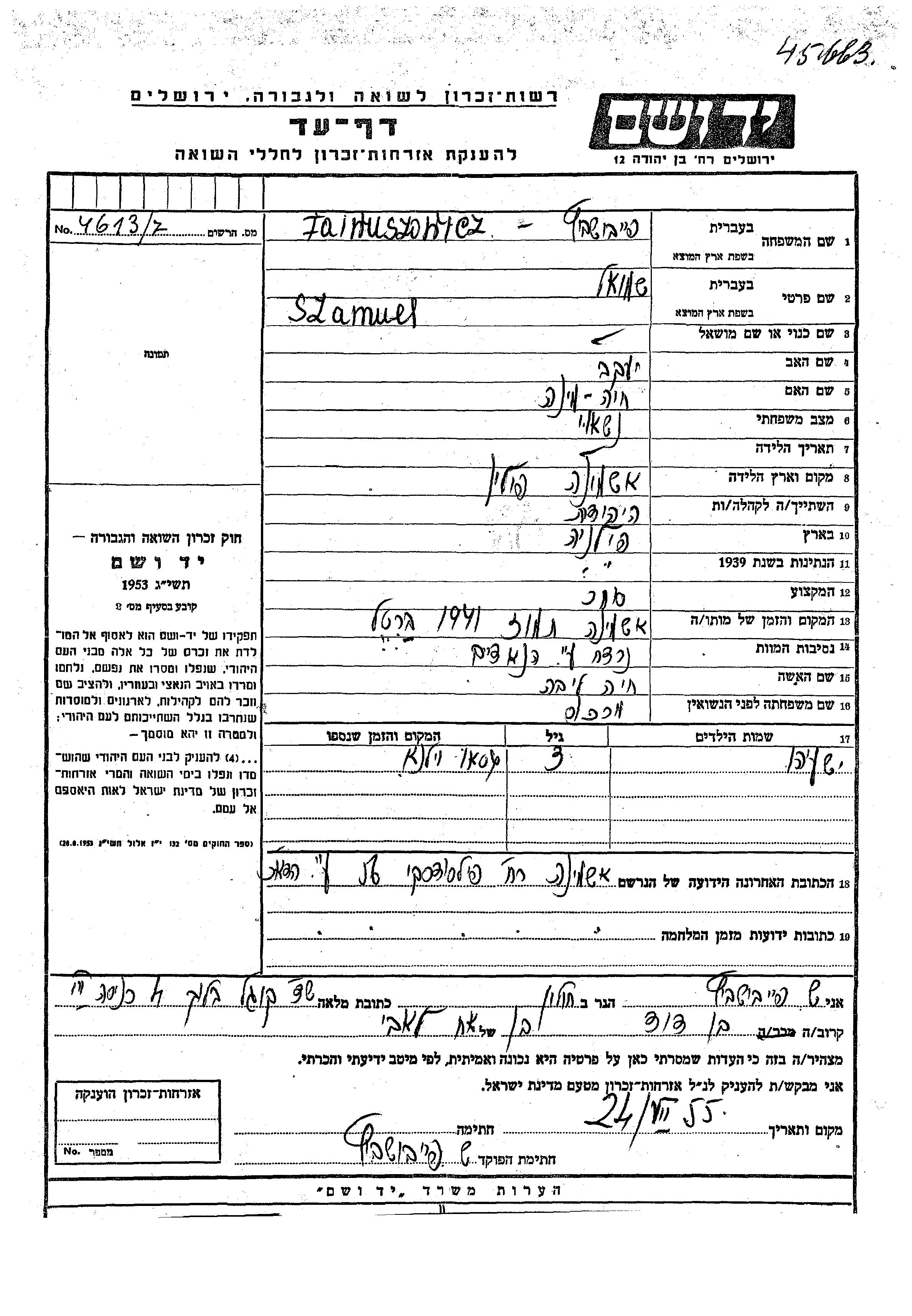 Yeshayahu Fajbuszowicz wurde Er war der Sohn von Szamuel und Markus, geb. Libe. Er war Kind. Vor dem Zweiten Weltkrieg lebte er in Oszmiana, Polen. Während des Krieges war er in Oszmiana, Polen.