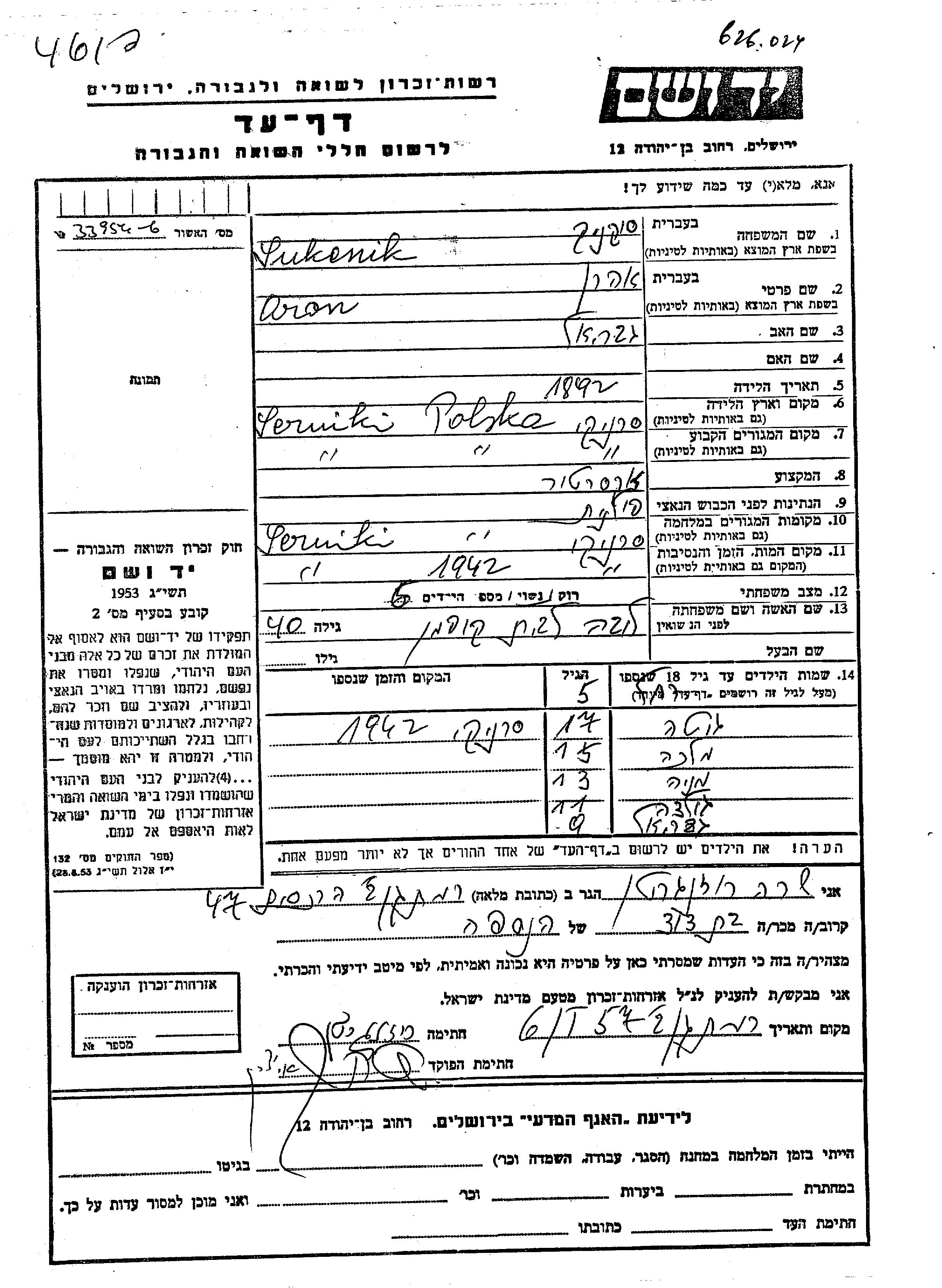 Mania Sukenik wurde Sie war die Tochter von Aron und Luba, geb. Kofman. Sie war Kind. Vor dem Zweiten Weltkrieg lebte sie in Serniki, Polen. Während des Krieges war sie in Serniki, Polen.