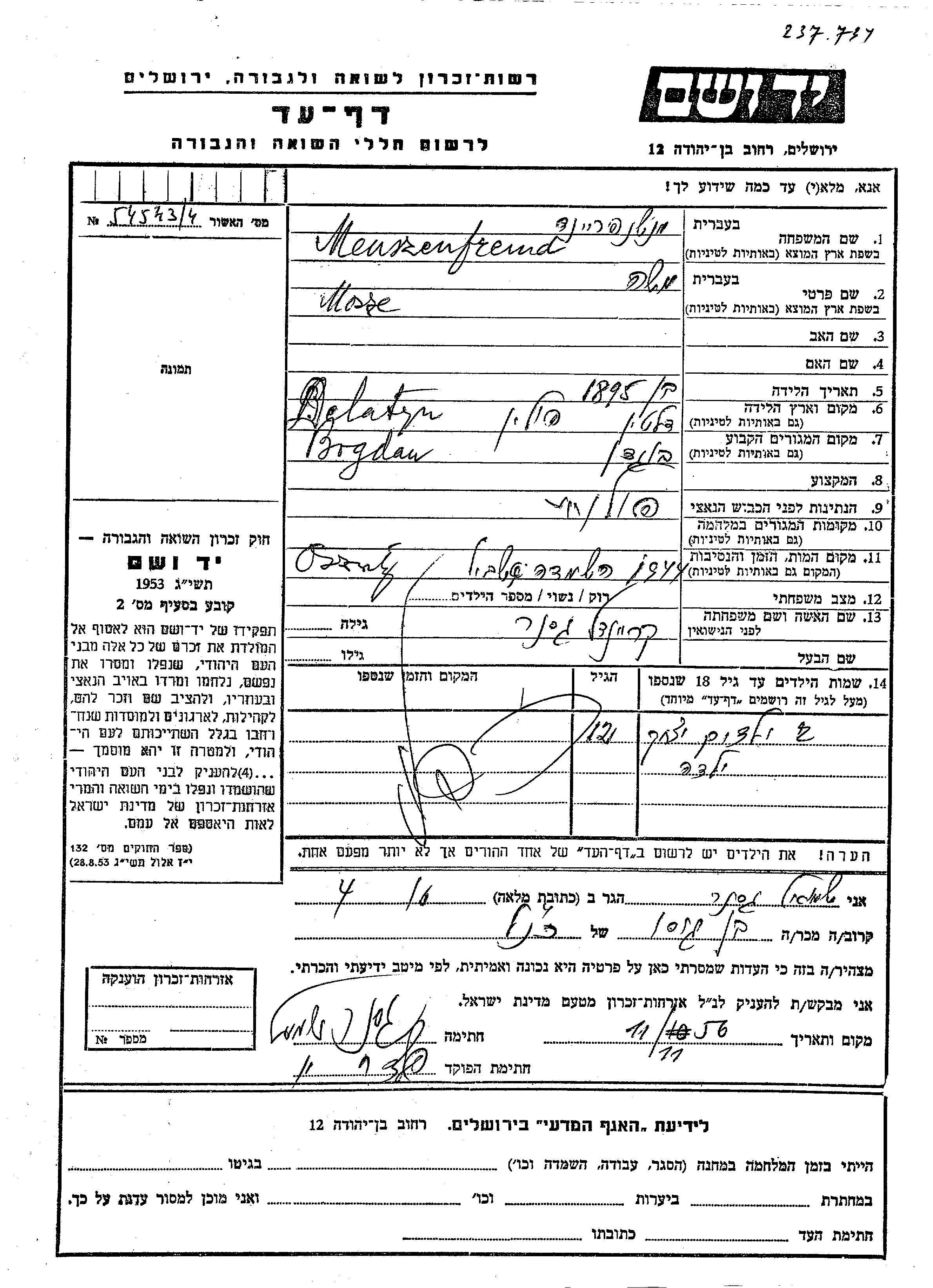 Yitzkhak Menszenfreind wurde Er war der Sohn von Mosze und Kreindel, geb. Gasner. Er war Kind. Vor dem Zweiten Weltkrieg lebte er in Bogdan, Tschechoslowakei.