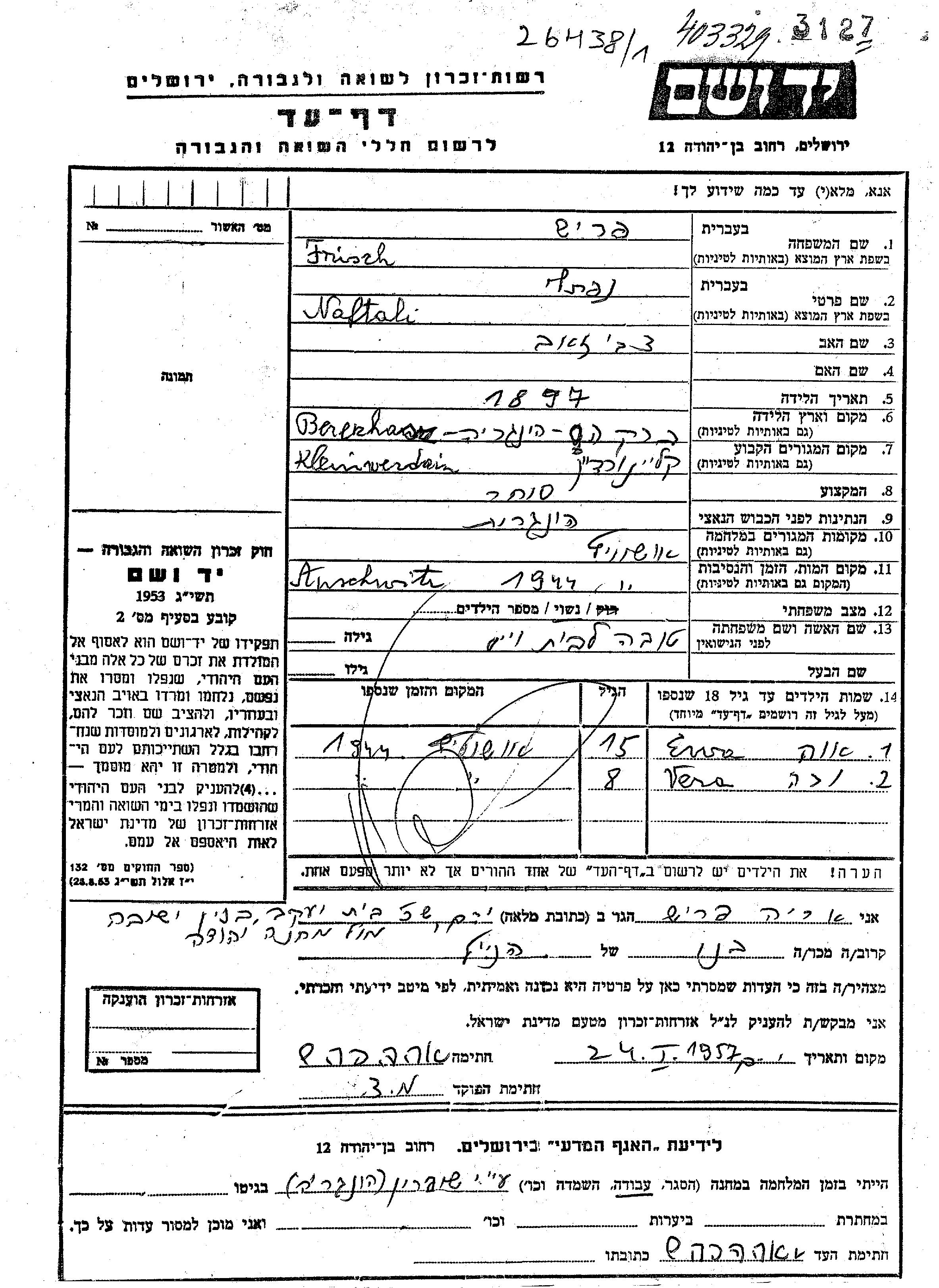 Eva Frisch wurde Sie war die Tochter von Naftali und Tova, geb. Veis. Sie war Kind. Während des Krieges war sie in Auschwitz, Polen.