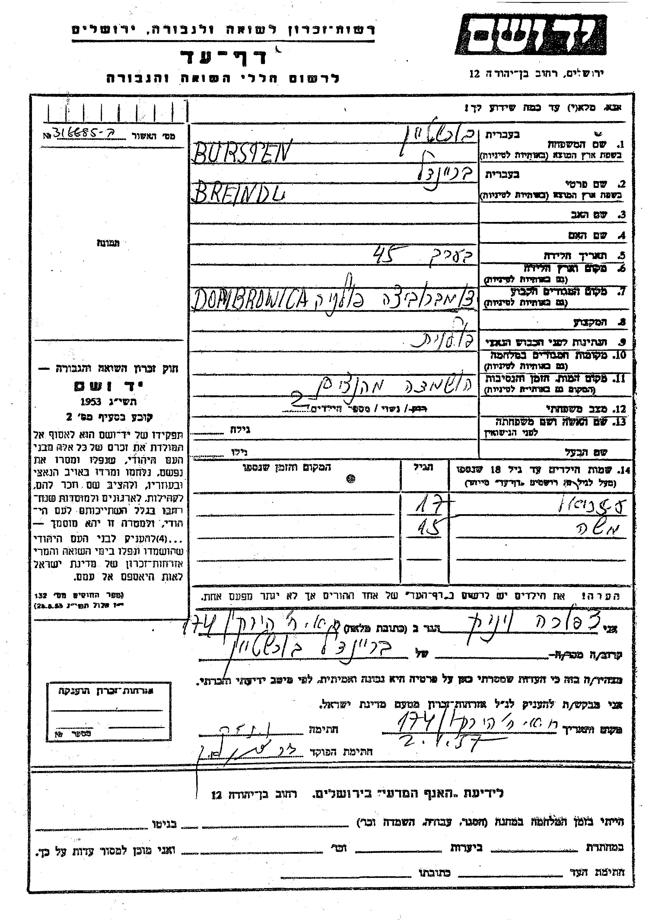 Moshe Bursten wurde Er war der Sohn von Breindl. Er war Kind. Vor dem Zweiten Weltkrieg lebte er in Dombrowica, Polen.