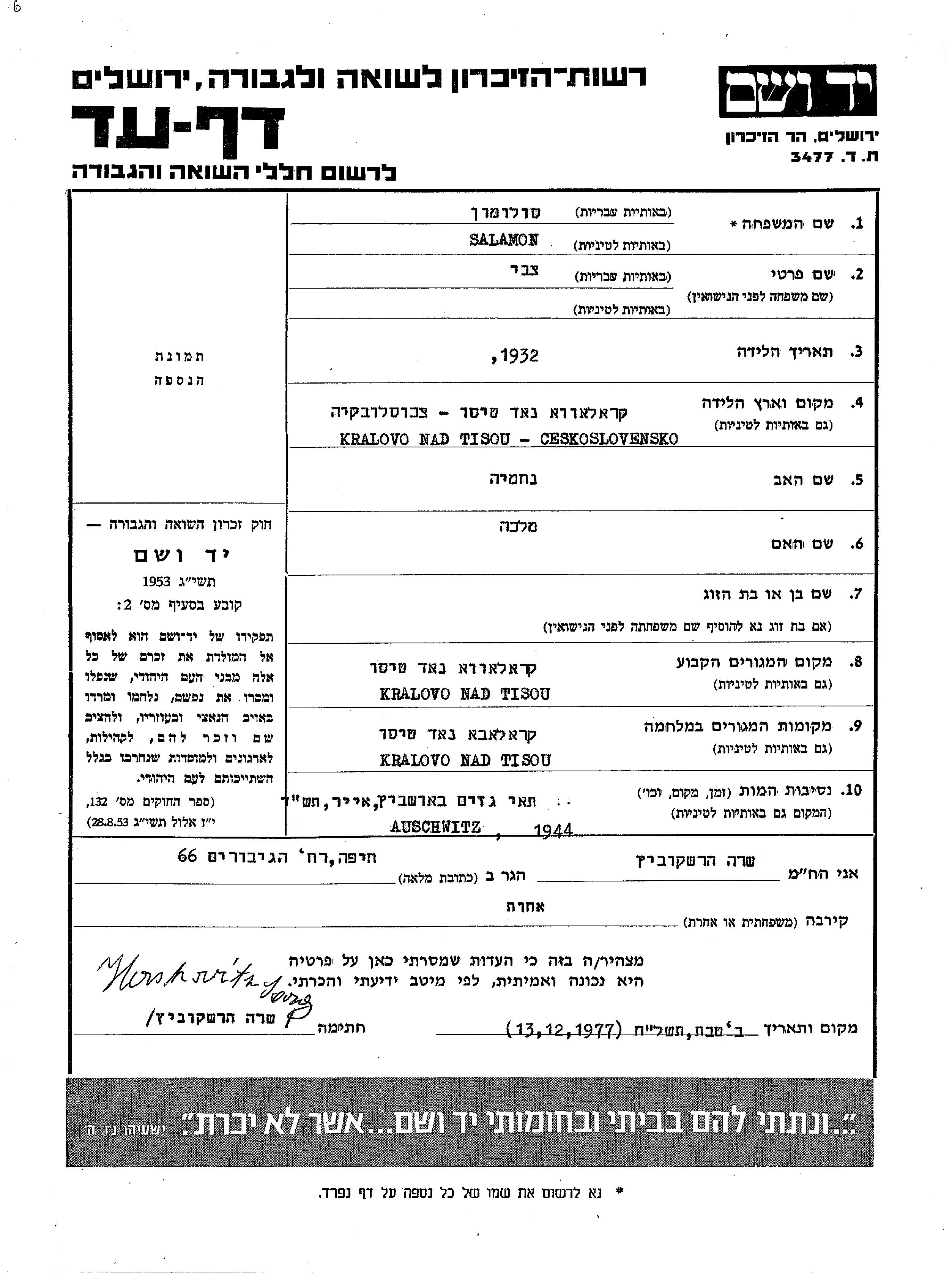 Tzvi Salomon wurde Er/sie war der/ die Sohn/Tochter von Nechemja und Malka, geb. Grinberger. Er/Sie war Kind. Vor dem Zweiten Weltkrieg er/sie in Kiralyhaza, Tschechoslowakei. Während des Krieges war er/sie in Kiralyhaza, Tschechoslowakei.