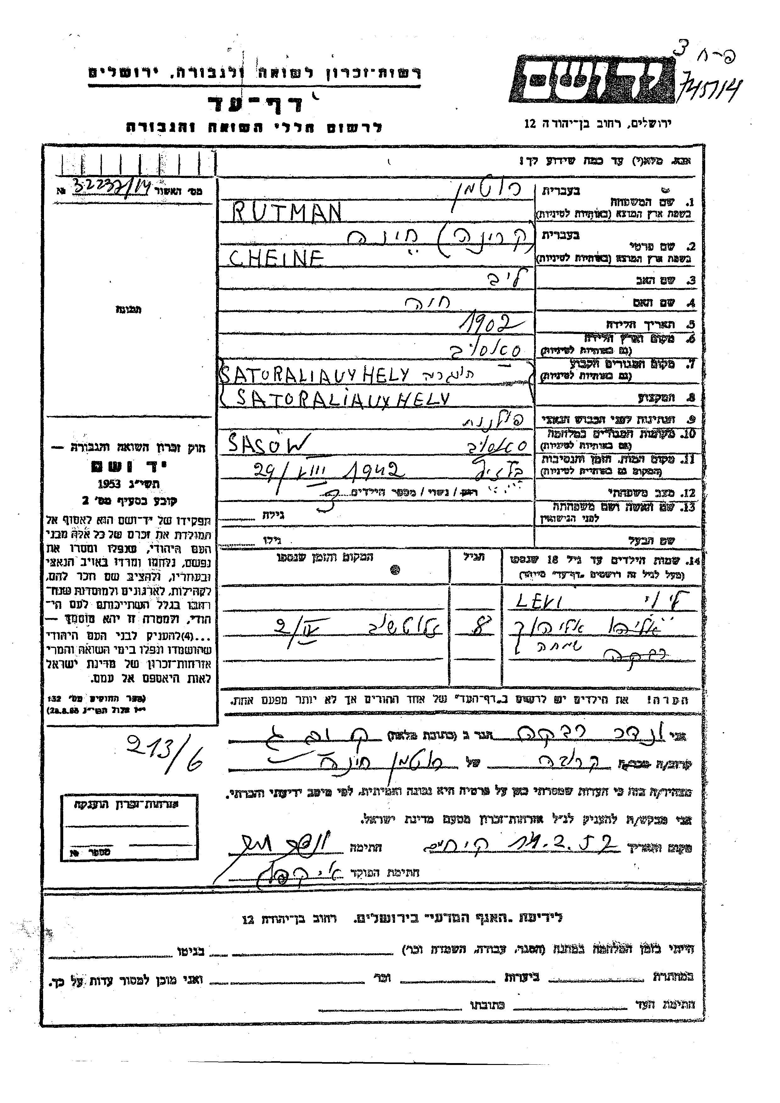 Levi Rutman Rotman wurde Er/sie war der/ die Sohn/Tochter von Cheine Khina Kreina. Er/Sie war Kind. Vor dem Zweiten Weltkrieg er/sie in Satoraljaujhely, Ungarn. Während des Krieges war er/sie in Sasow, Polen.