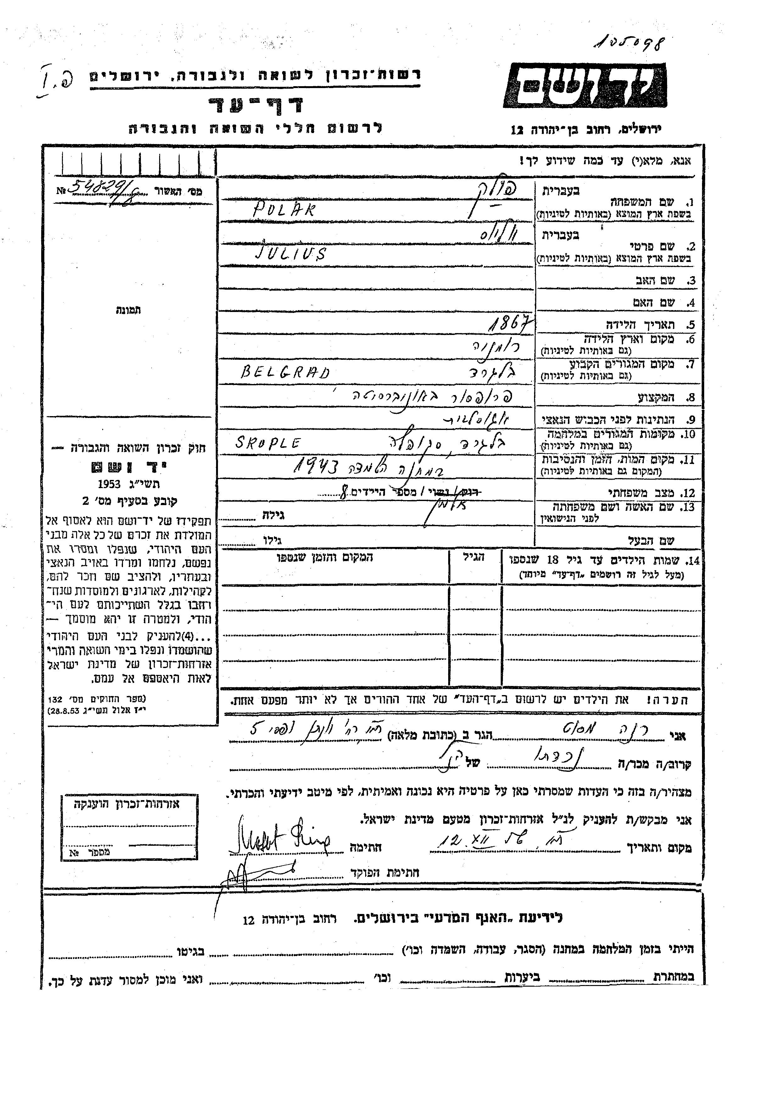 Prof. Julius Polak wurde im Jahr 1867 in Rumänien geboren. Er war Professor und Witwer. Vor dem Zweiten Weltkrieg lebte er in Belgrad, Jugoslawien. Während des Krieges war er in Skoplje, Jugoslawien.