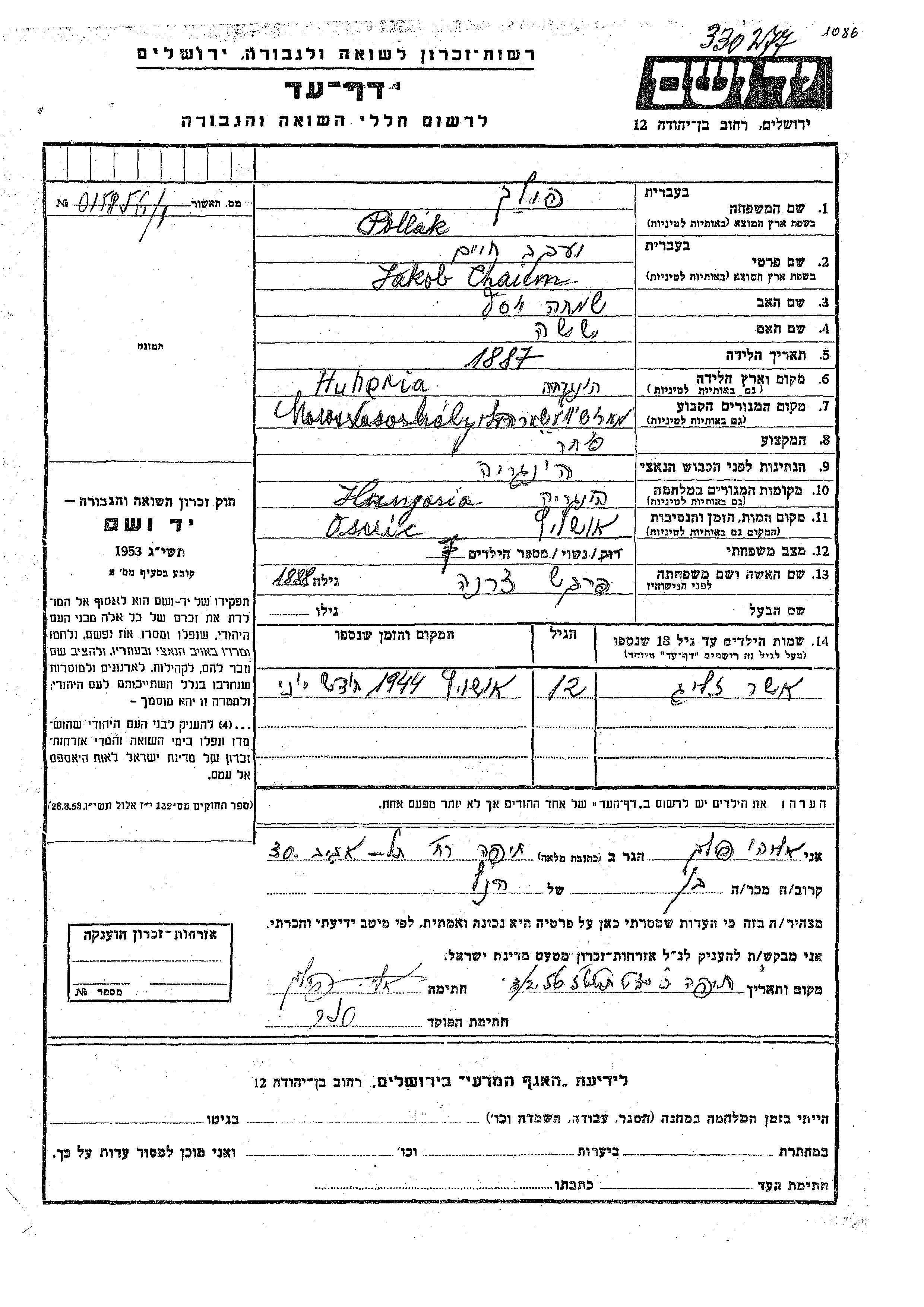 Jakob Chaiim Pollak wurde im Jahr 1887 in Ungarn geboren. Er war der Sohn von Simkha Yosef und Shasha. Er war Kaufmann/-frau und mit Charna, geb. Farkash Verheiratet. Vor dem Zweiten Weltkrieg lebte er in Marosvasarhely, Rumänien. Während des Krieges war er in Ungarn.