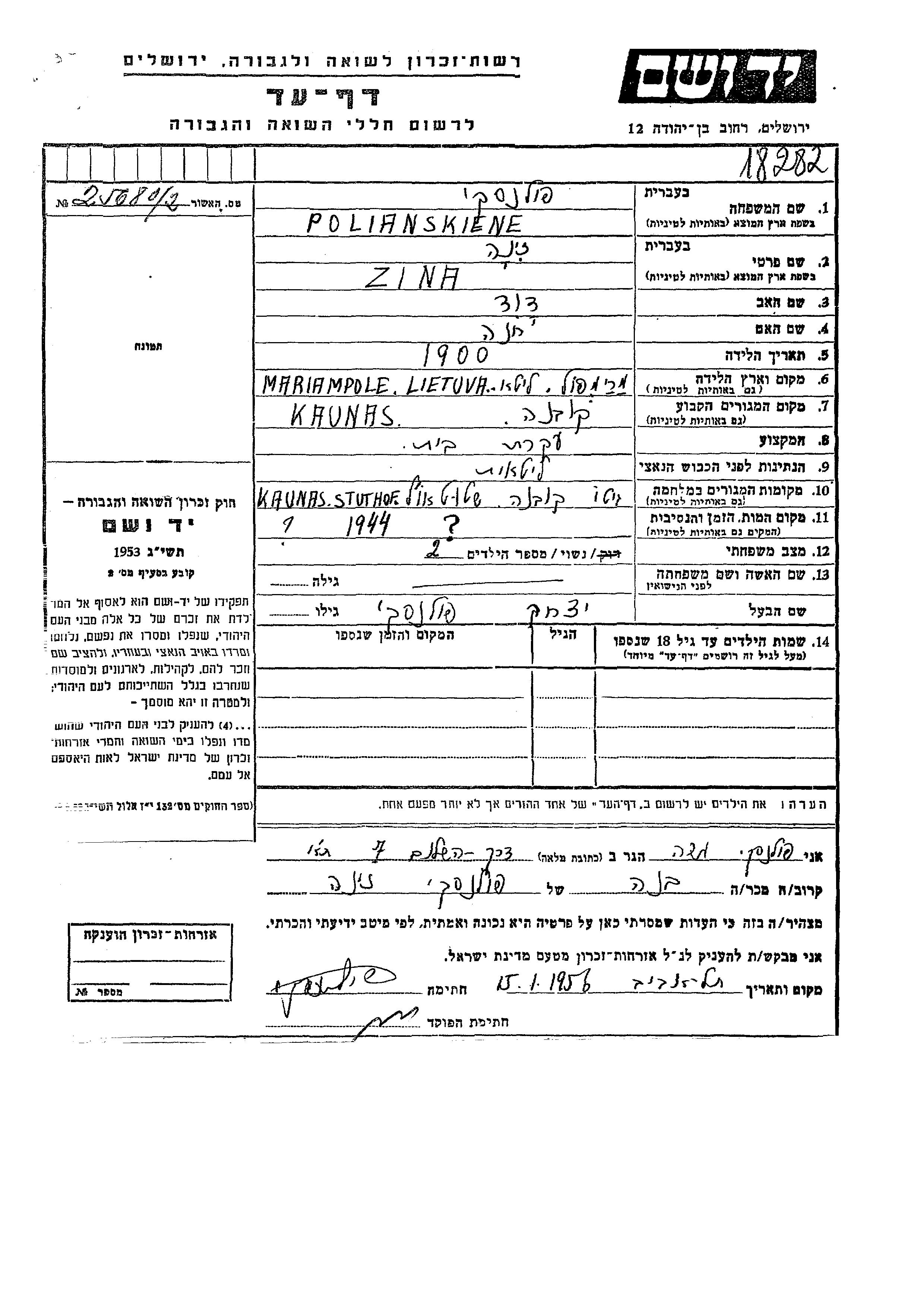 Zina Polianskiene wurde im Jahr 1900 in Mariampol, Litauen geboren. Sie war die Tochter von David und Khana. Sie war Hausfrau und mit Yitzkhak Verheiratet. Vor dem Zweiten Weltkrieg lebte sie in Kaunas, Litauen. Während des Krieges war sie in Stutthof, Freie Stadt Danzig.