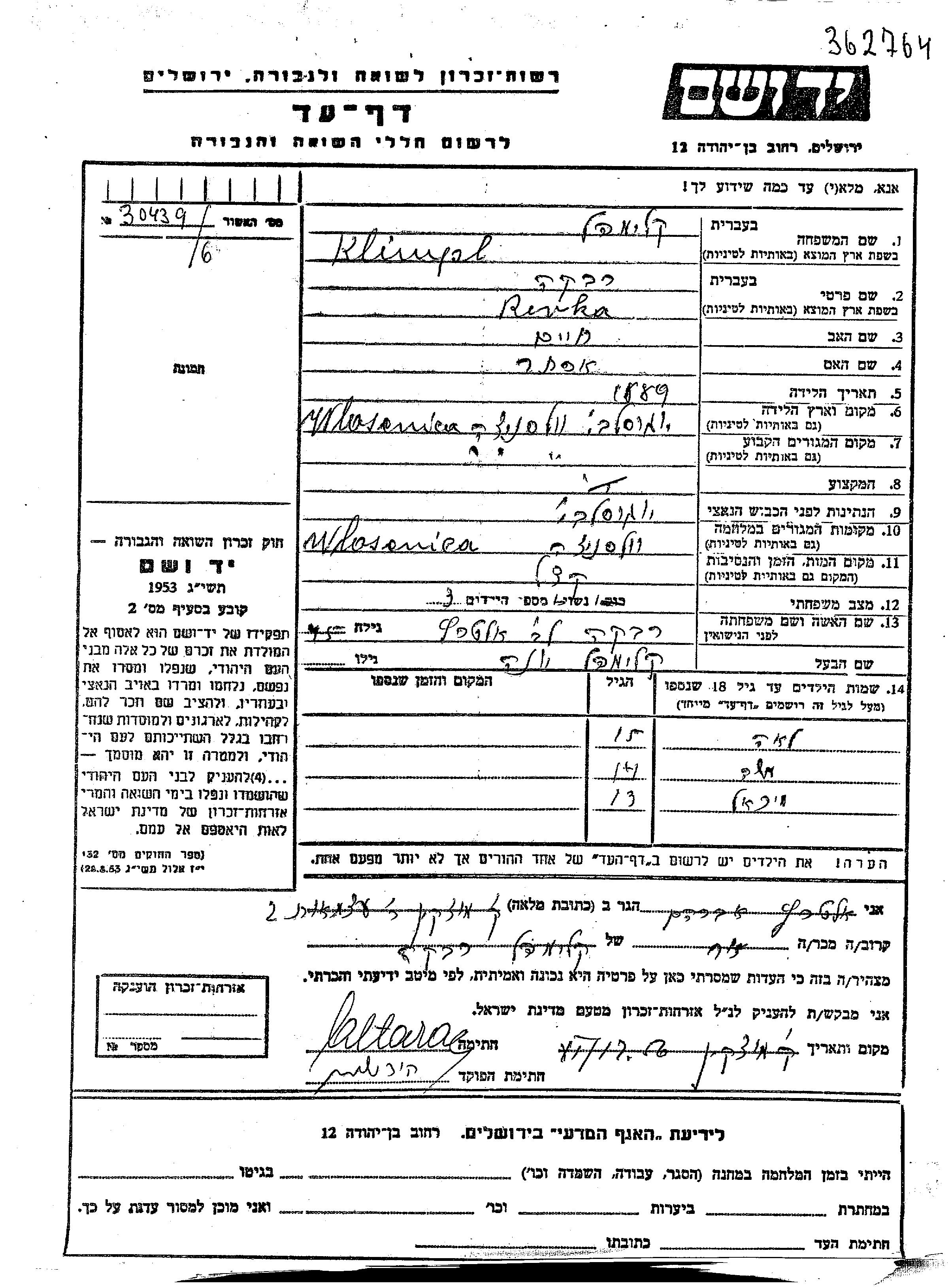 Moshe Klimpl wurde Er war der Sohn von Yona und Revka, geb. Altaratz. Er war Kind. Vor dem Zweiten Weltkrieg lebte er in Vlasenica, Jugoslawien. Während des Krieges war er in Vlasenica, Jugoslawien.