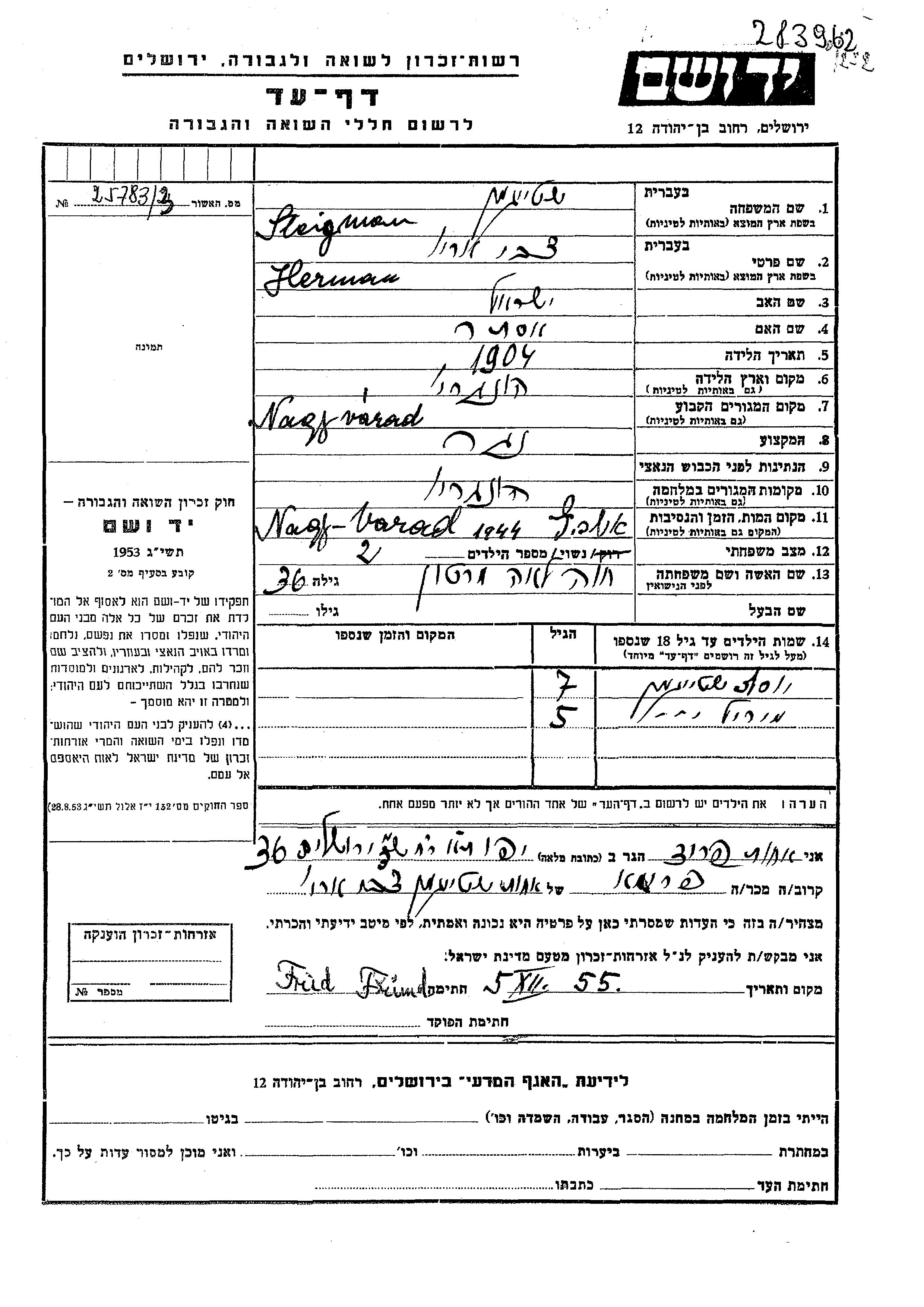 Yosef Steigman wurde Er war der Sohn von Herman Tzvi Arie und Khava Lea, geb. Marton. Er war Kind. Vor dem Zweiten Weltkrieg lebte er in Nagj Eced, Ungarn. Während des Krieges war er in Ungarn.