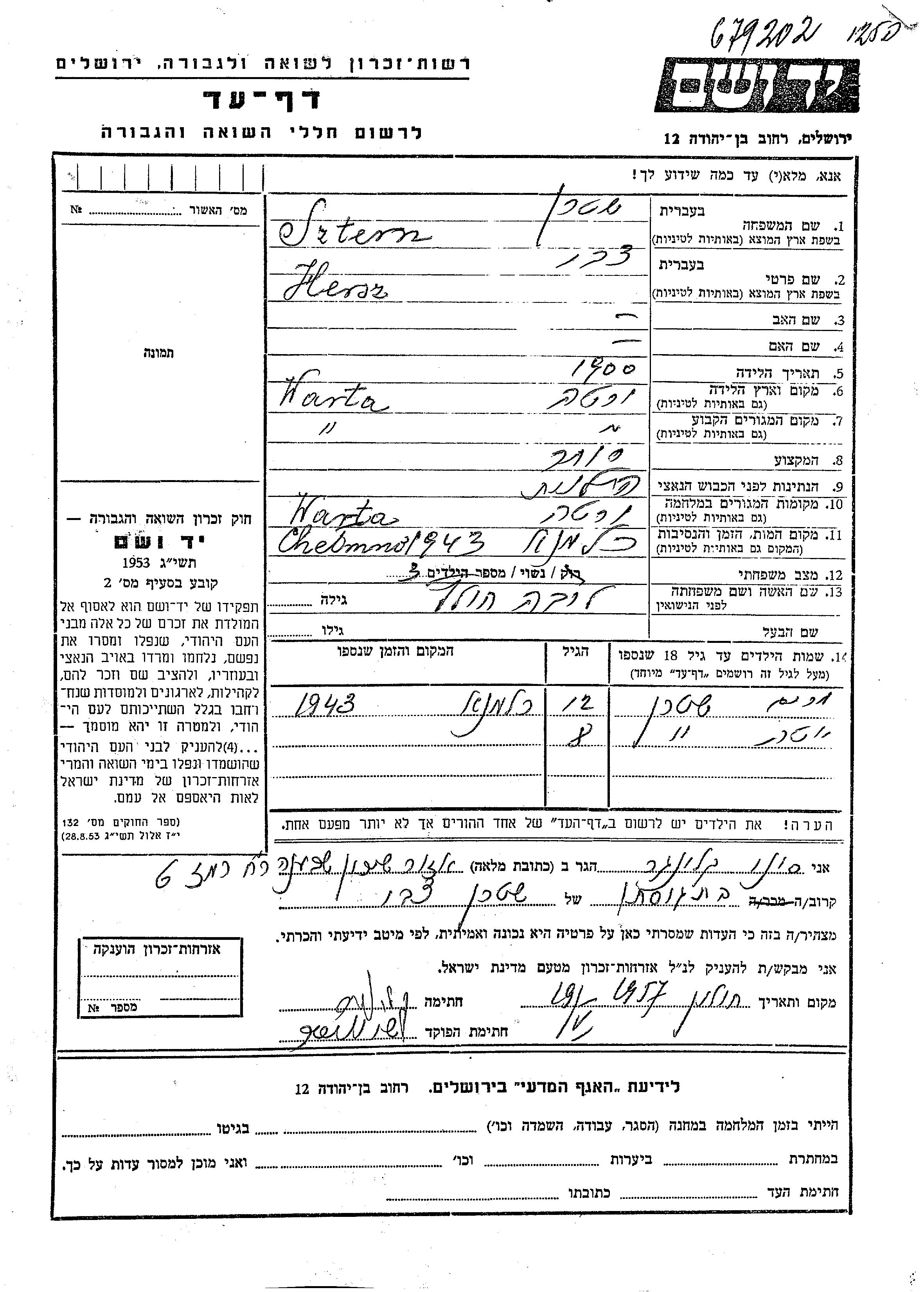 Miriam Sztern wurde Sie war die Tochter von Hersz Tzvi und Luba, geb. Khuletz. Sie war Kind. Vor dem Zweiten Weltkrieg lebte sie in Warta, Polen. Während des Krieges war sie in Warta, Polen.