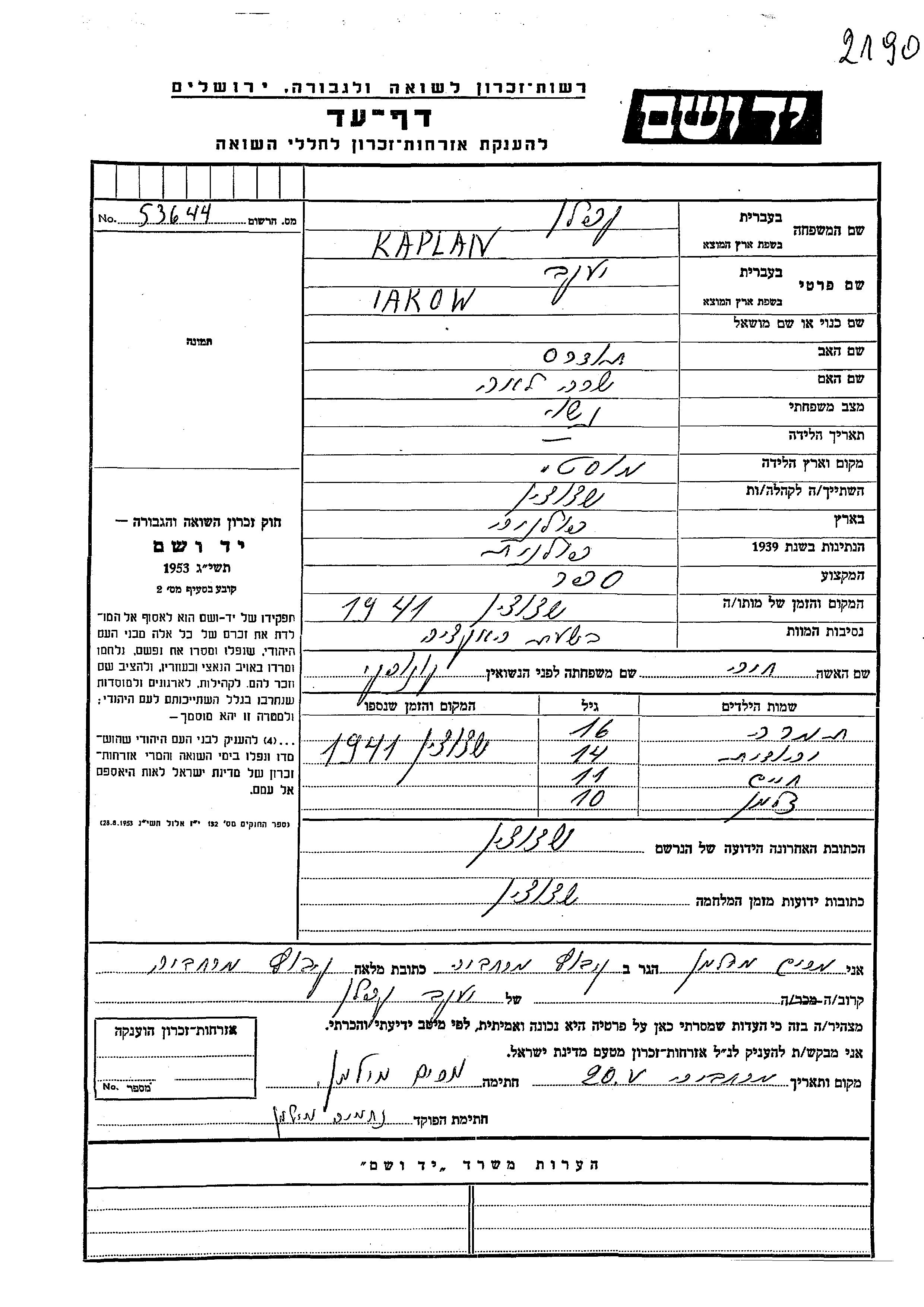 Khaia Kaplan wurde Er/sie war der/ die Sohn/Tochter von Iakow und Khaia, geb. Konopka. Er/Sie war Kind. Vor dem Zweiten Weltkrieg er/sie in Szczuczyn, Polen. Während des Krieges war er/sie in Szczuczyn, Polen.