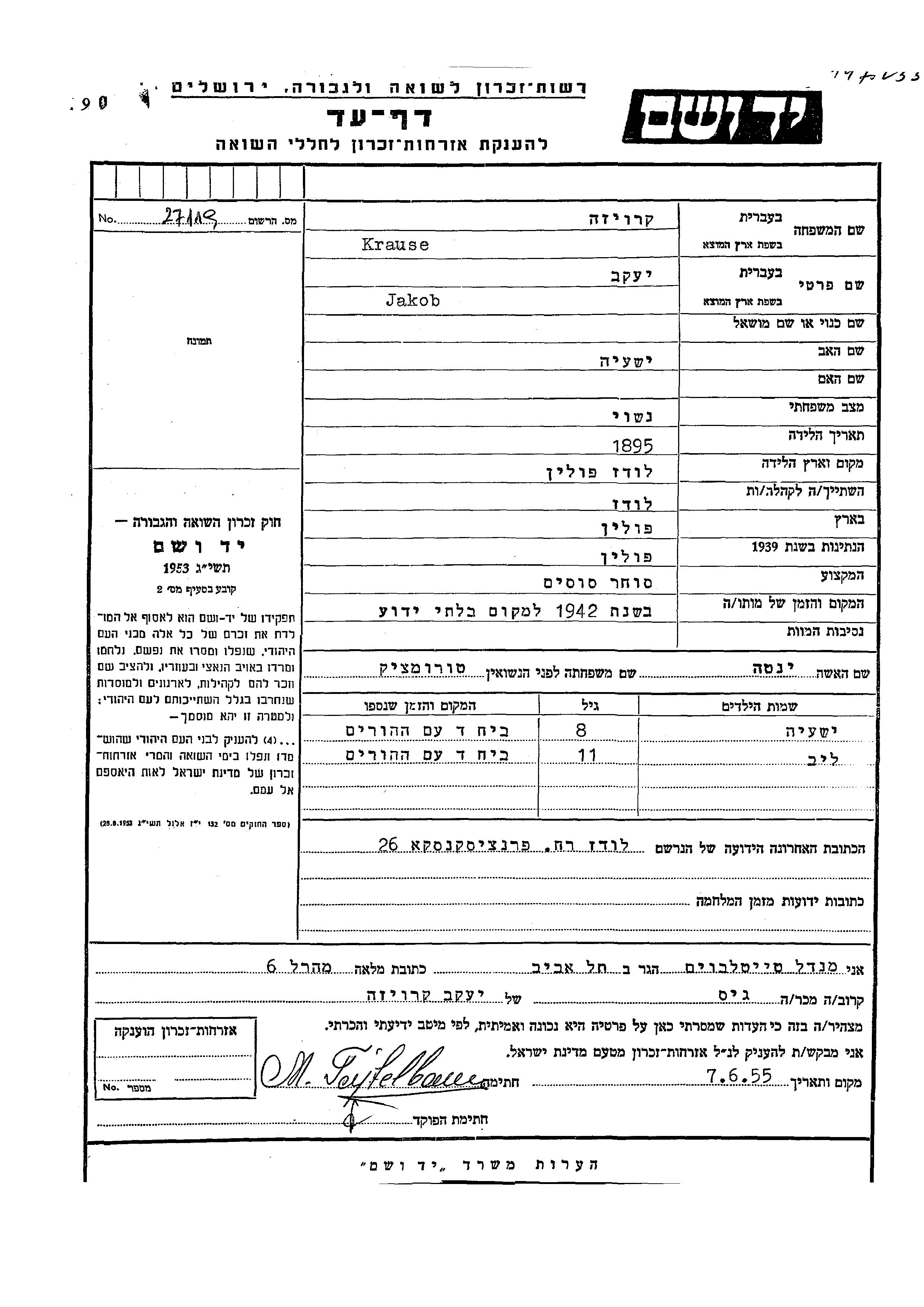 Yeshiyah Krause Kroize wurde Er war der Sohn von Jakob und Yenta, geb. Torunchik. Er war Kind. Vor dem Zweiten Weltkrieg lebte er in Lodz, Polen. Während des Krieges war er in Lodz, Polen.