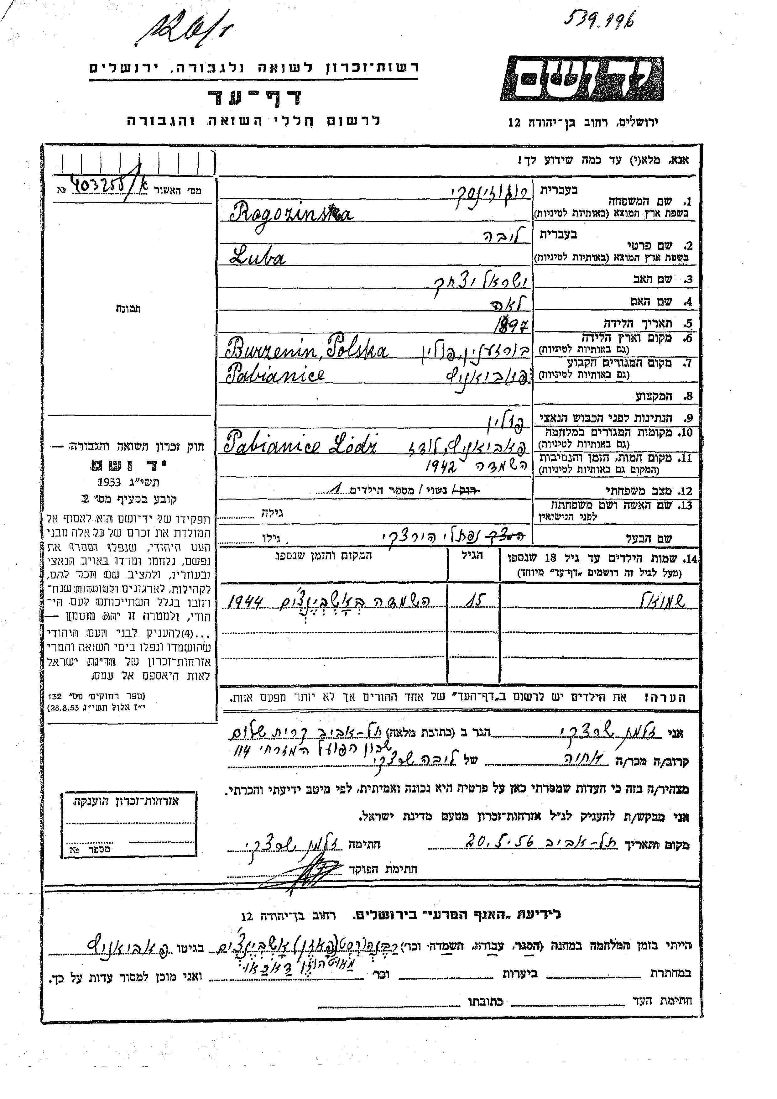 Shmuel Rogozinska wurde Er war der Sohn von Naftali Hirtzki und Luba, geb. Sheratzki. Er war Kind. Vor dem Zweiten Weltkrieg lebte er in Pabianice, Polen. Während des Krieges war er in Pabianice, Polen.