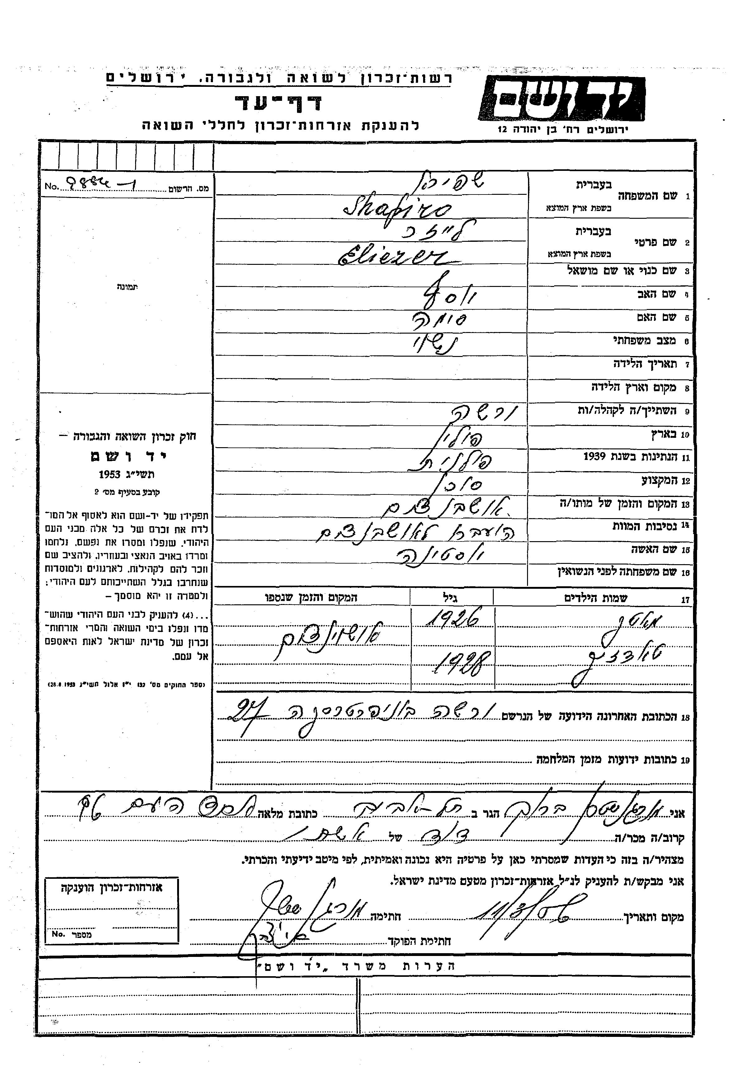 Todzik Shapiro wurde Er war der Sohn von Leizer und Yustina. Er war Kind. Vor dem Zweiten Weltkrieg lebte er in Warsaw, Polen. Während des Krieges war er in Polen.