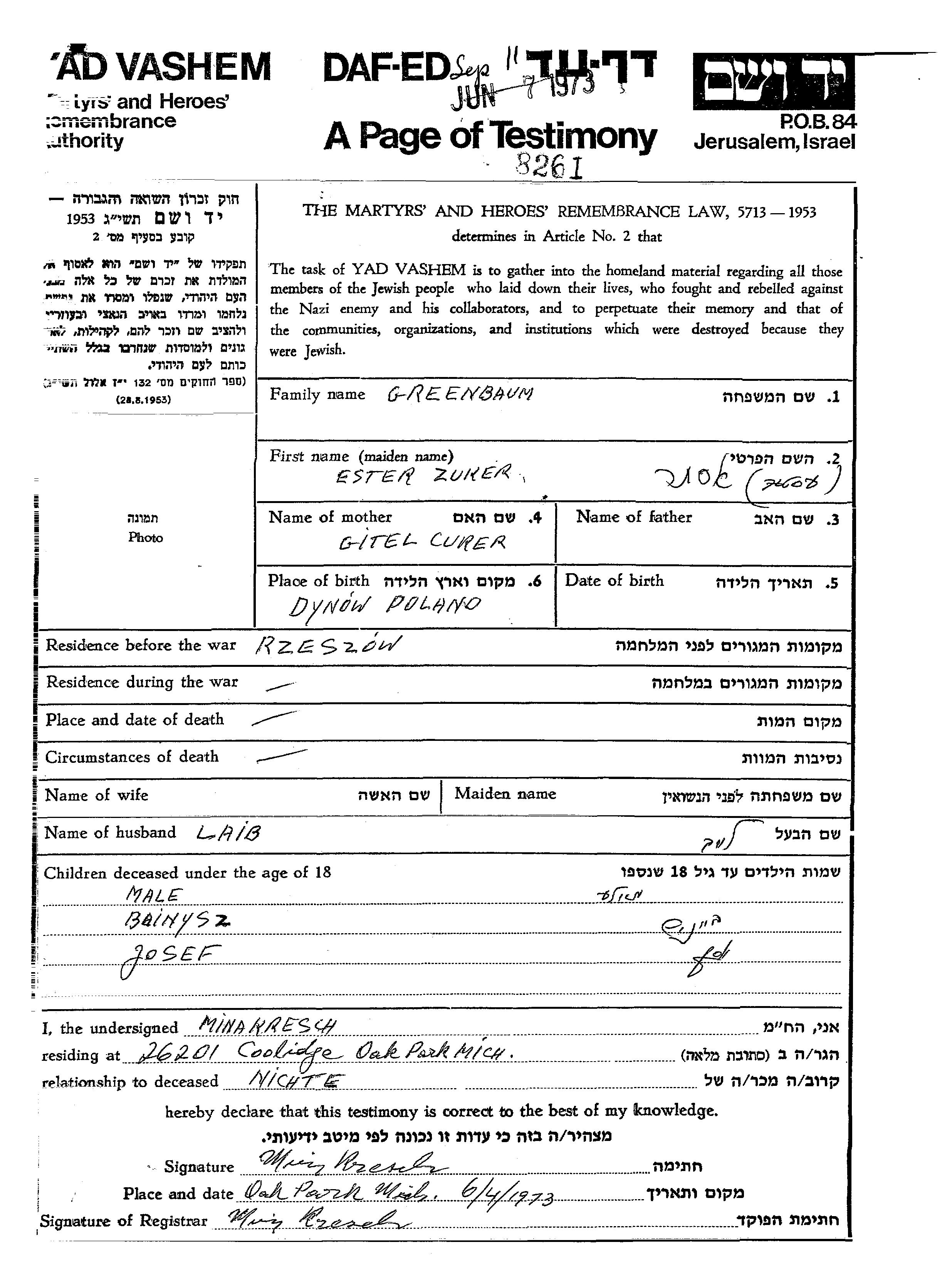 Greenbaum Malka unbekannter Ort, Gedenkblatt