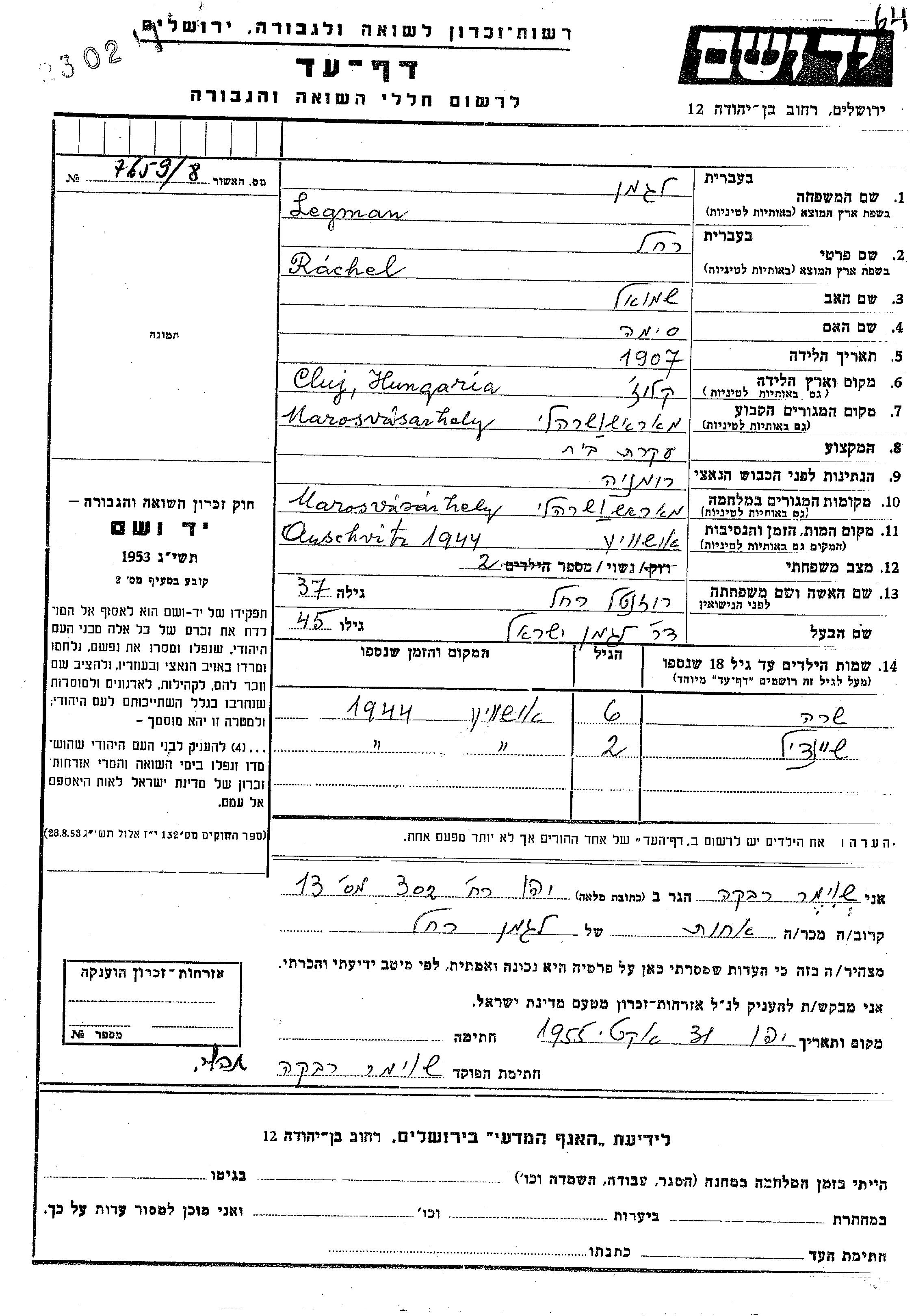 Sara Legman wurde Sie war die Tochter von Yisrael und Rachel, geb. Rozental. Sie war Kind. Vor dem Zweiten Weltkrieg lebte sie in Maros Vasarhely, Rumänien. Während des Krieges war sie in Maros Vasarhely, Rumänien.