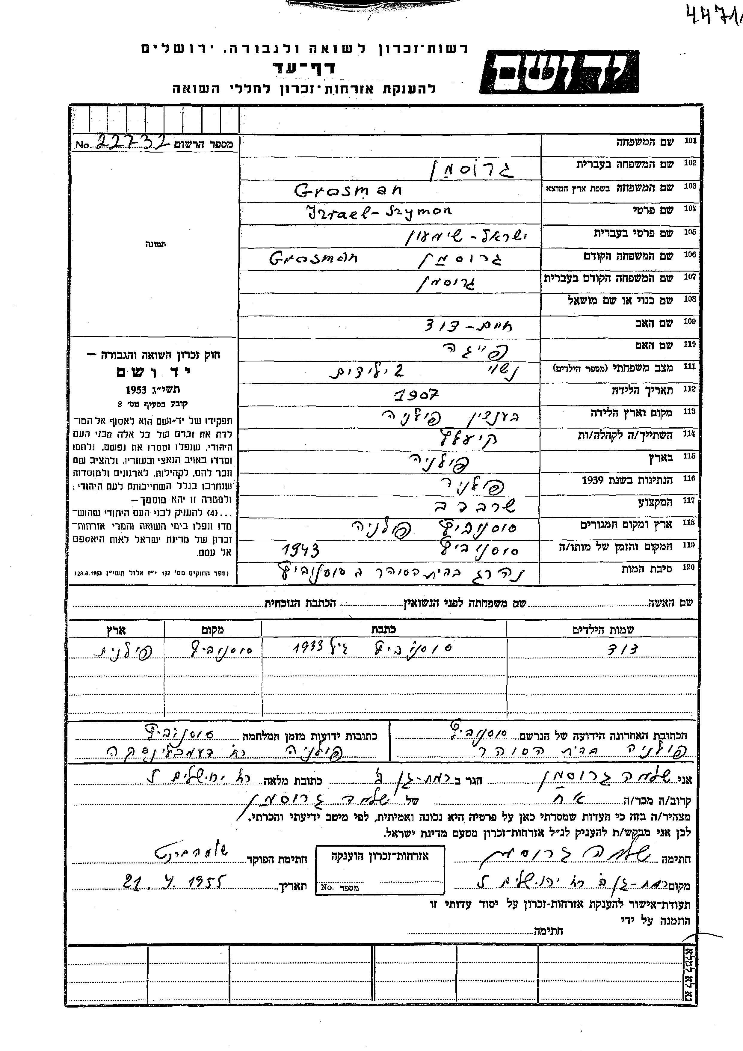 Grosman David 1933 Kielce, Polen Gedenkblatt
