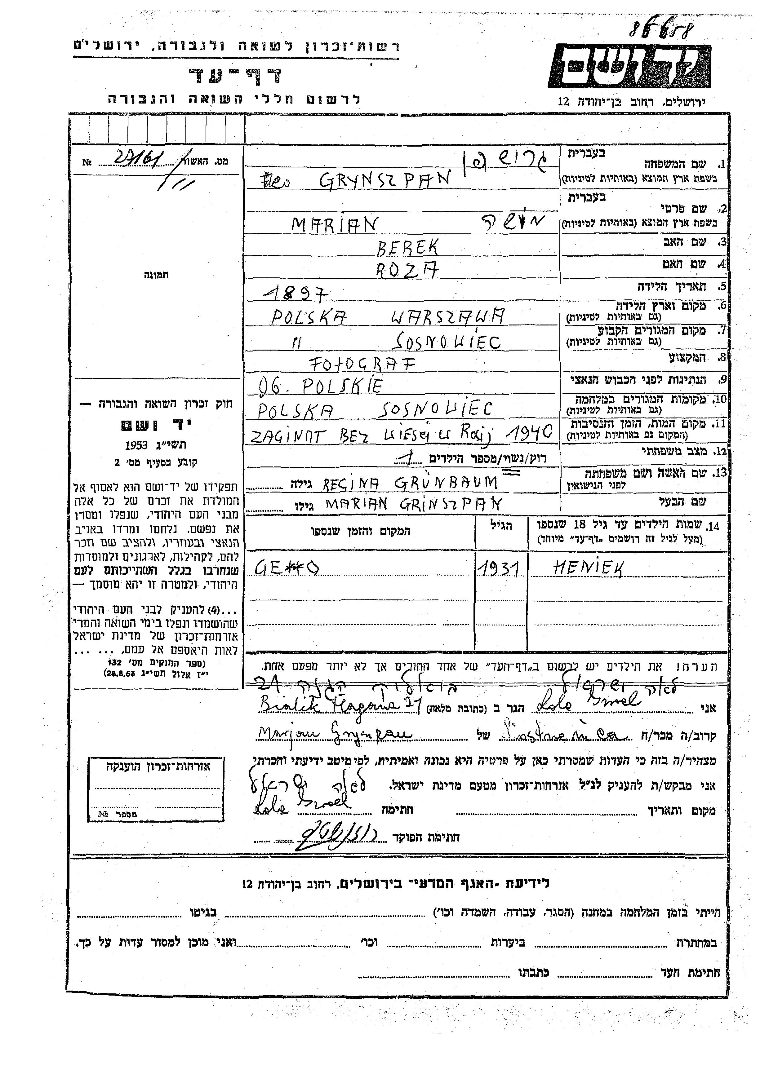 Heniek Grynszpanholc Grinshpan wurde Er war der Sohn von Moshe Marian. Er war Kind. Vor dem Zweiten Weltkrieg lebte er in Sosnowiec, Polen. Während des Krieges war er in Sosnowiec, Polen.
