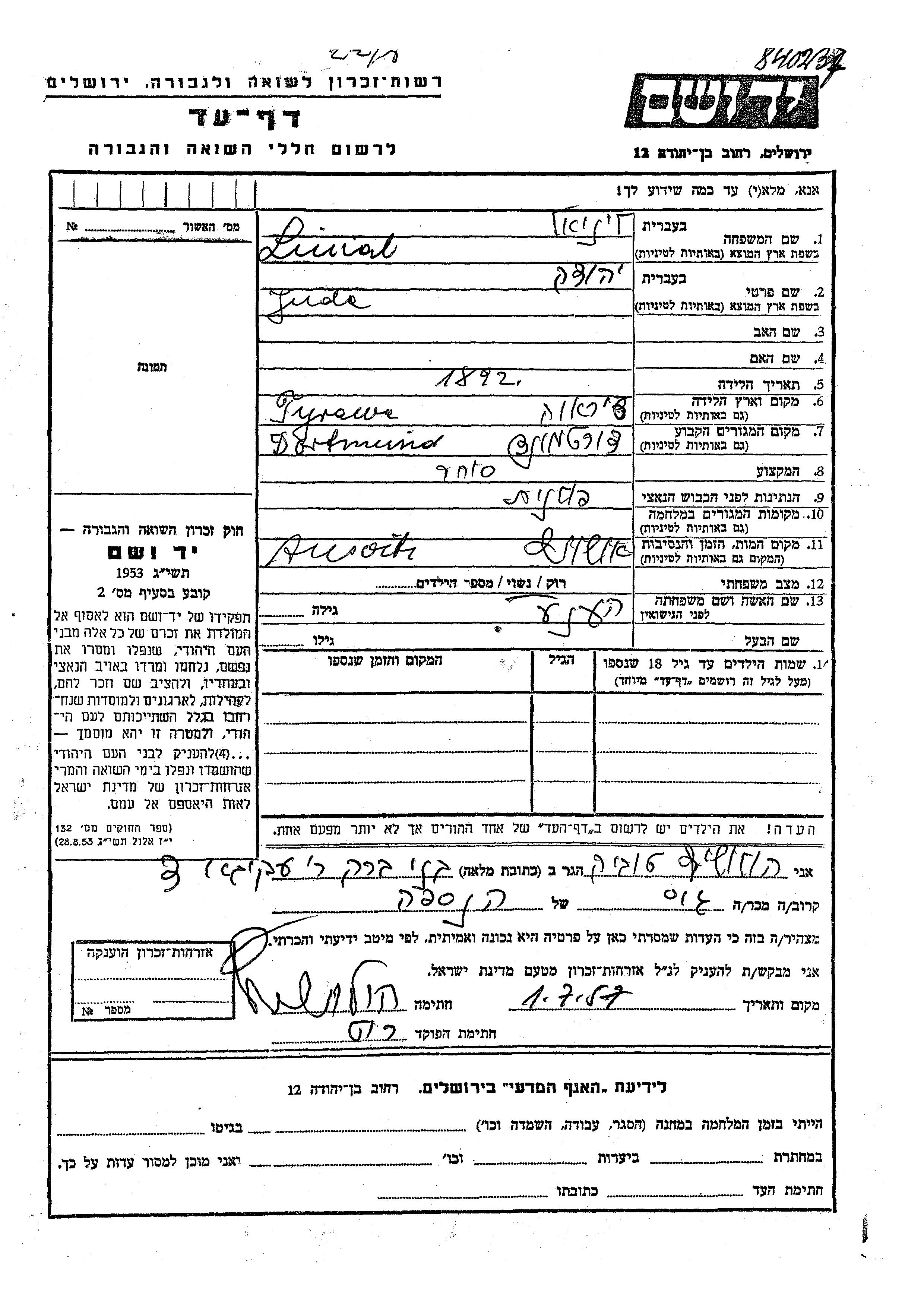 Juda Linial wurde im Jahr 1892 in Tyrawa, Polen geboren. Er war Kaufmann/-frau und mit Hene Verheiratet. Vor dem Zweiten Weltkrieg lebte er in Dortmund, Deutsches Reich. Während des Krieges war er in Polen.