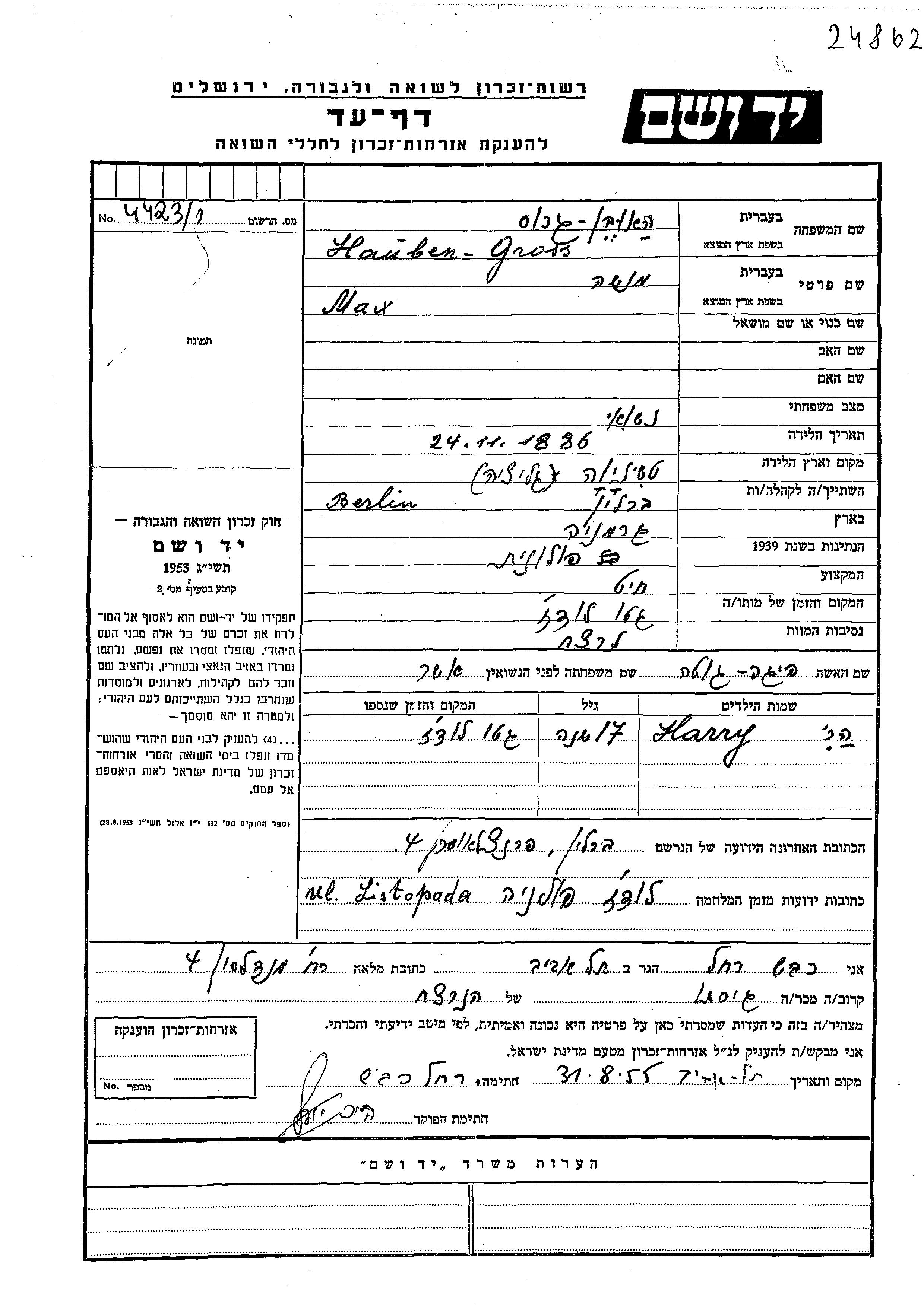 Hary Gross Hauben wurde Er war der Sohn von Max Menashe und Feiga Guta, geb. Asher. Er war Kind. Vor dem Zweiten Weltkrieg lebte er in Berlin, Deutsches Reich. Während des Krieges war er in Lodz, Polen.