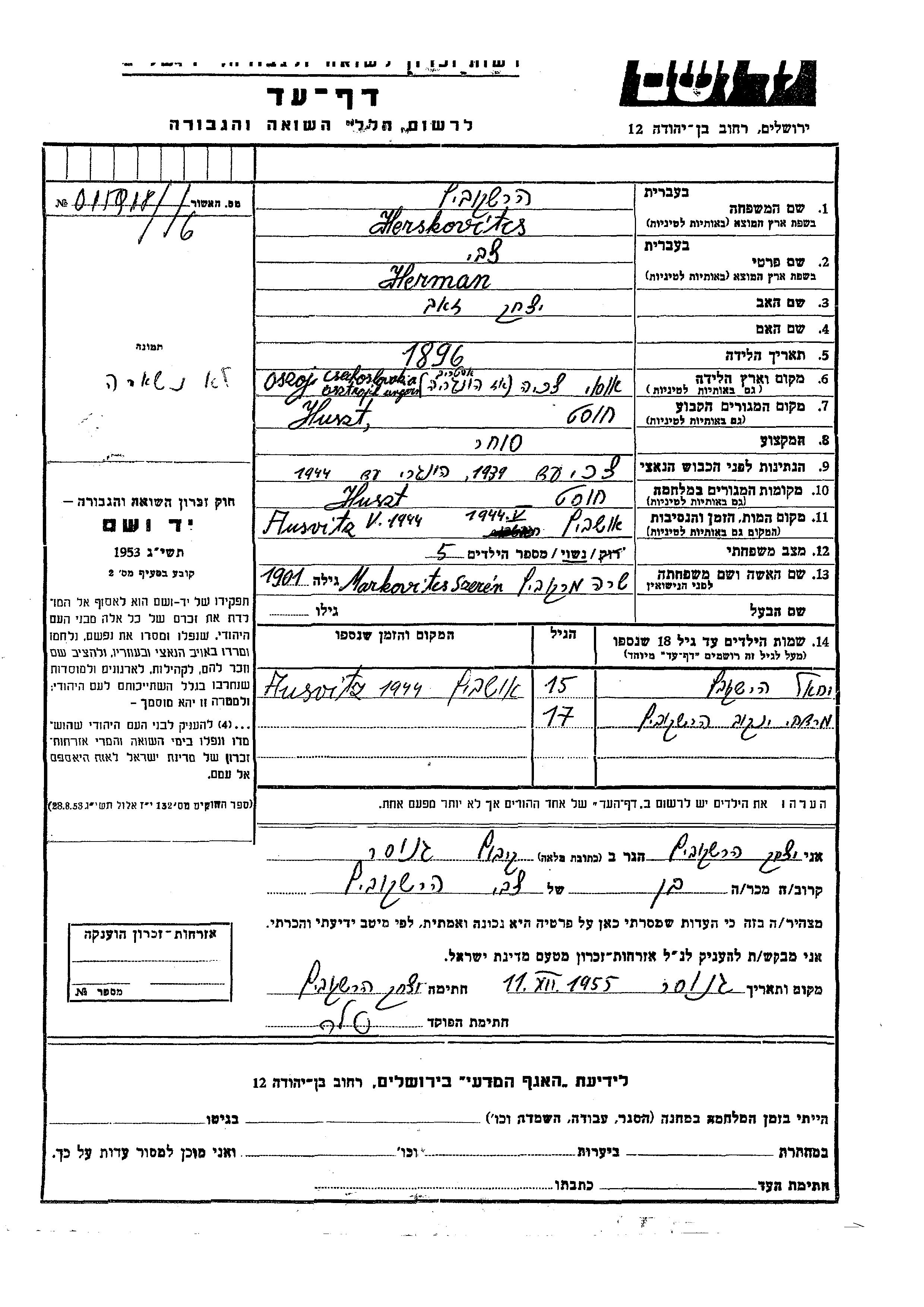 Mordekhai Yaakov Herskovitcs wurde Er war der Sohn von Herman Tzvi und Szeren, geb. Markovitcs. Er war Kind. Vor dem Zweiten Weltkrieg lebte er in Hust. Während des Krieges war er in Hust.