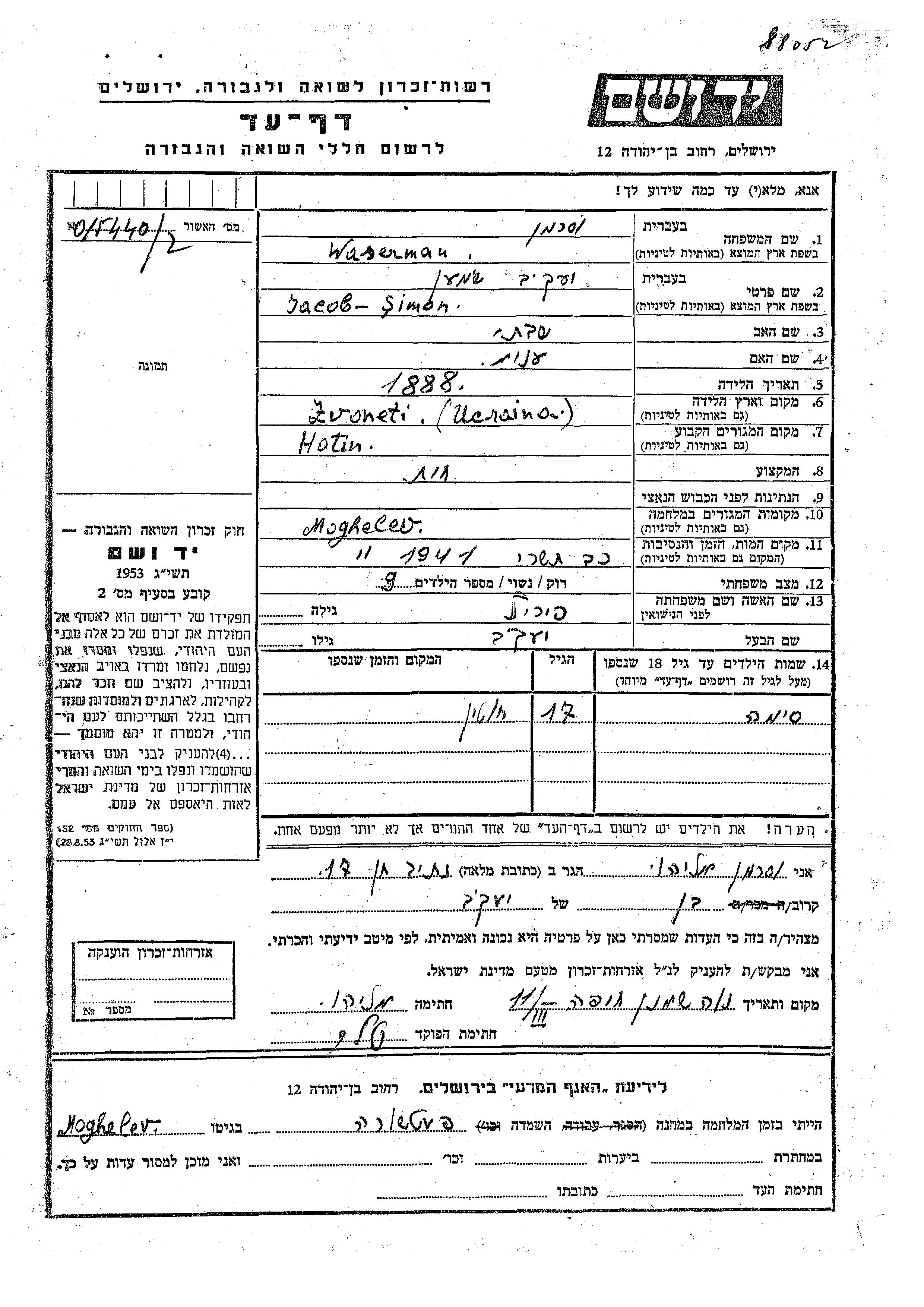 Sima Waserman wurde Er/sie war der/ die Sohn/Tochter von Yacob Shimon und Perel. Er/Sie war Kind. Vor dem Zweiten Weltkrieg er/sie in Hotin, Rumänien.