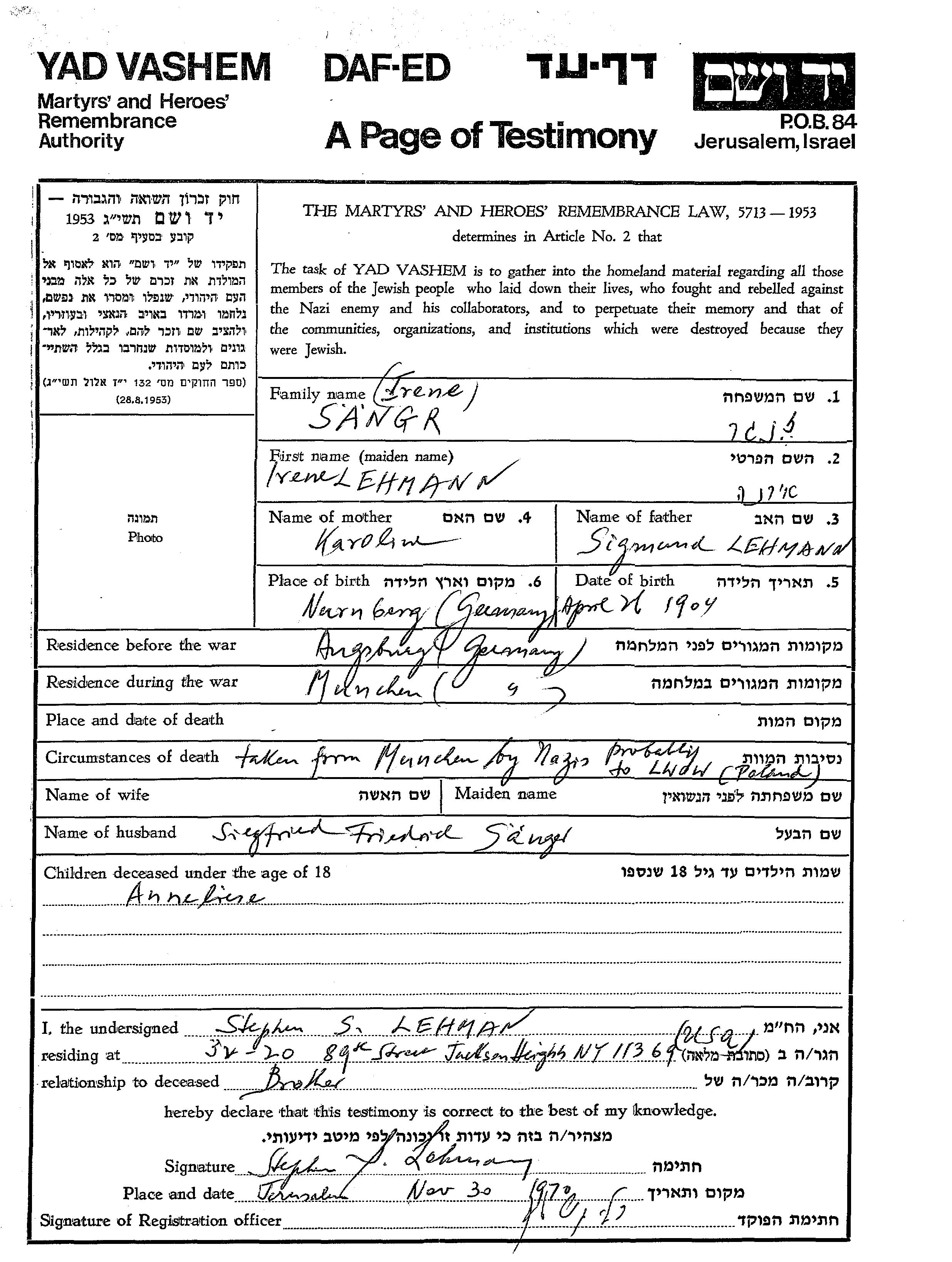Anneliese Sangr Zinger wurde Sie war die Tochter von Irene, geb. Lehmann. Sie war Kind. Vor dem Zweiten Weltkrieg lebte sie in Augsburg, Deutsches Reich. Während des Krieges war sie in Munich, Deutsches Reich.