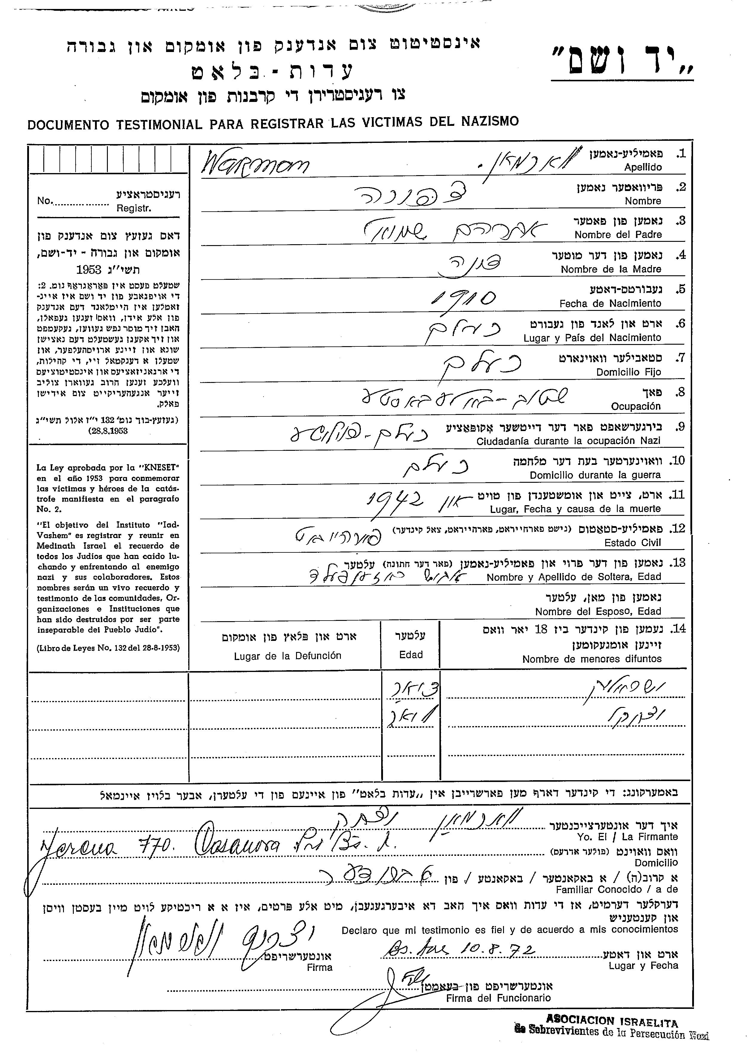 Rozenfeld Yitzkhak Chelm, Polen Gedenkblatt