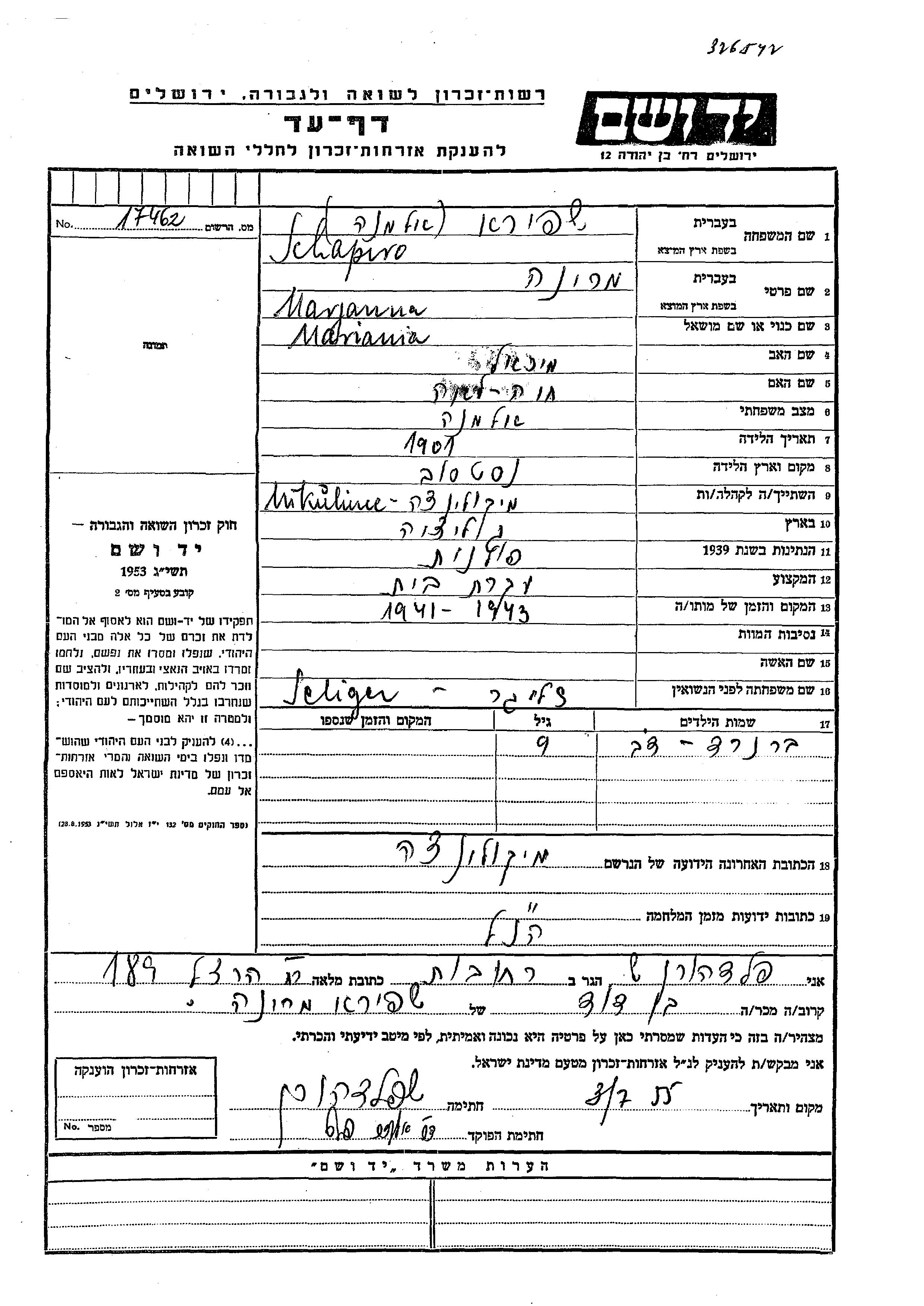 Bernard Dov Schapiro wurde Er war der Sohn von Marjanna Marina, geb. Seliger. Er war Kind. Vor dem Zweiten Weltkrieg lebte er in Mikulince, Polen. Während des Krieges war er in Mikulince, Polen.