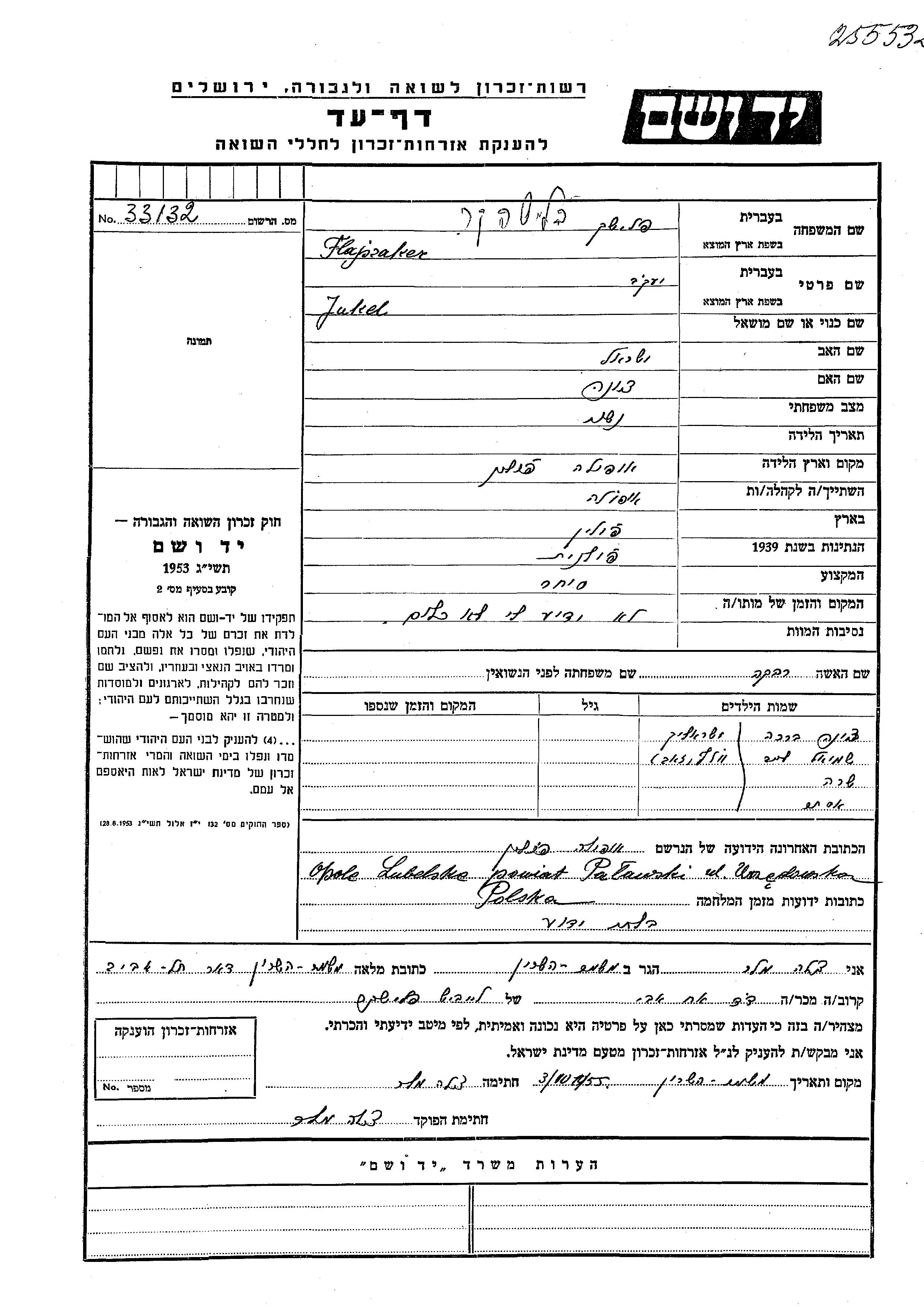 Shmuel Leib Flajszaker wurde Er war der Sohn von Jakel und Rivka. Er war Kind. Vor dem Zweiten Weltkrieg lebte er in Opole, Polen. Während des Krieges war er in Opole, Polen.