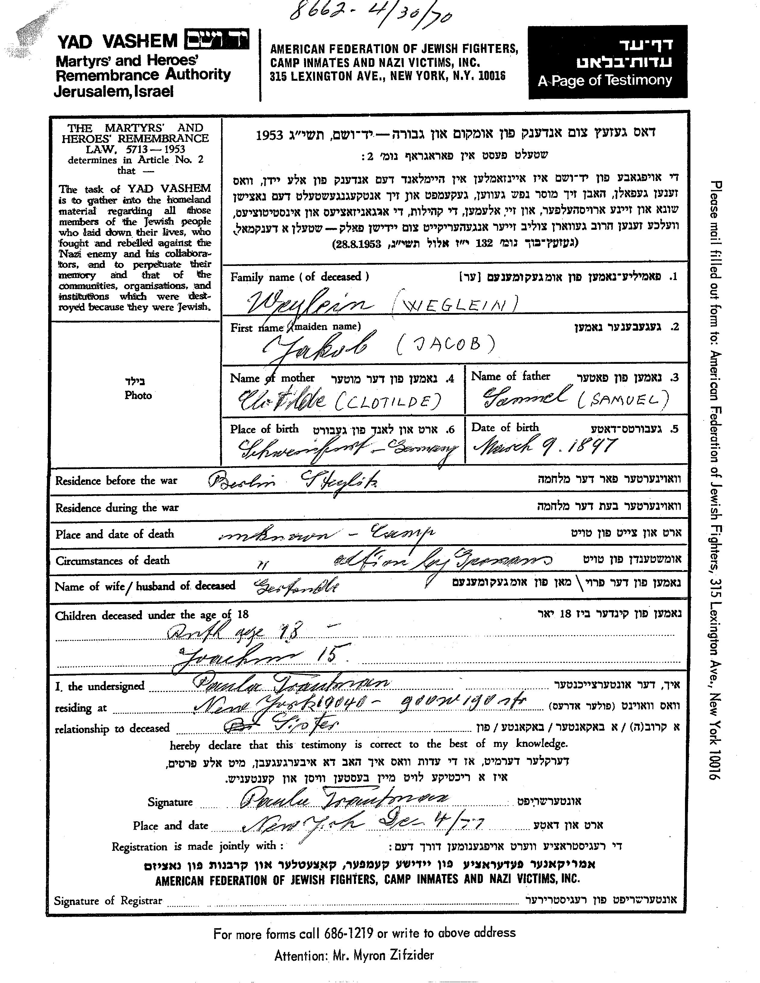 Ruth Weglein wurde Sie war die Tochter von Jakob und Gertrude, geb. Simon. Sie war Kind. Vor dem Zweiten Weltkrieg lebte sie in Berlin, Deutsches Reich.