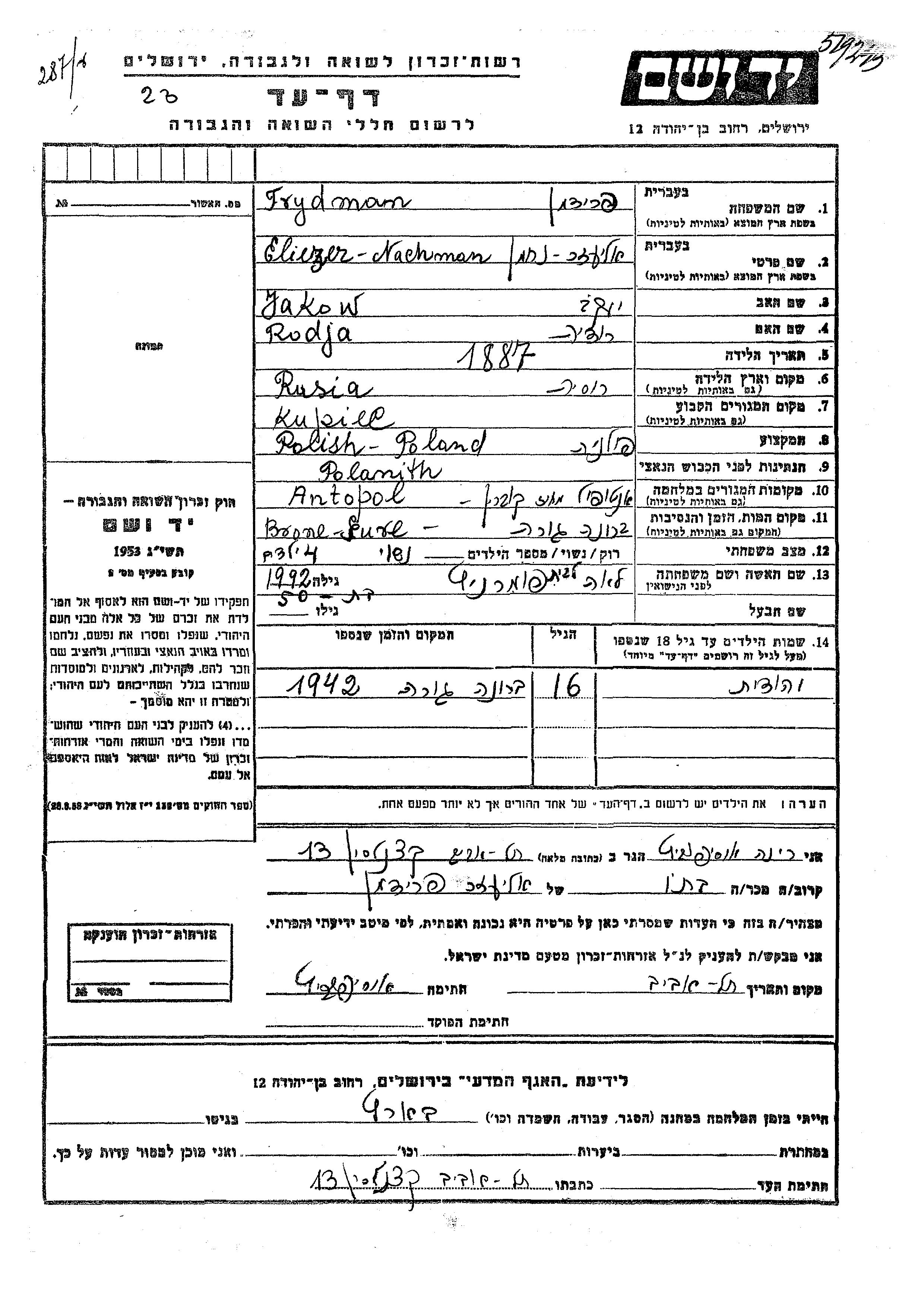 Yehudit Frydman wurde Sie war die Tochter von Nachman Eliezer und Lea, geb. Pomerantz. Sie war Kind. Vor dem Zweiten Weltkrieg lebte sie in Polen. Während des Krieges war sie in Antopol, Polen.