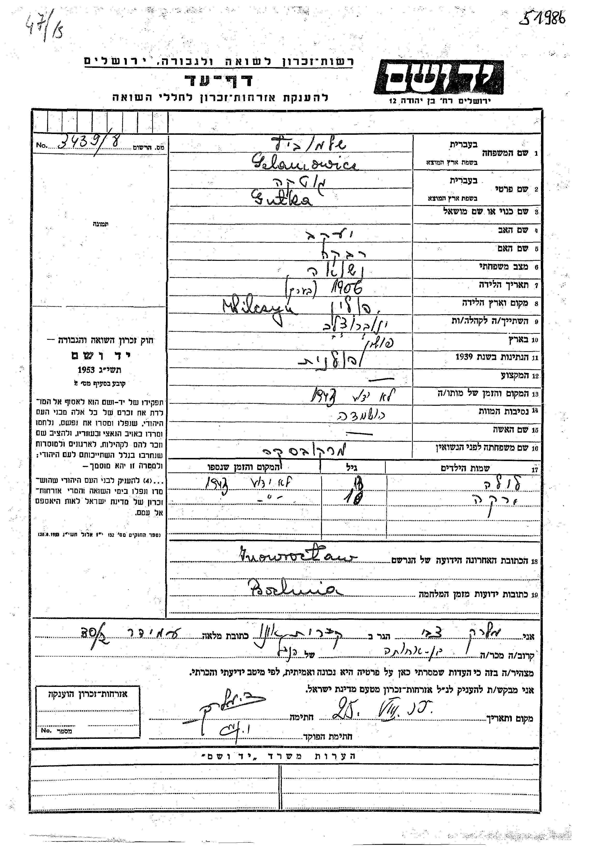 Irka Szlamowicz wurde Sie war die Tochter von Gutka, geb. Markovska. Sie war Kind. Vor dem Zweiten Weltkrieg lebte sie in Inowroclaw, Polen. Während des Krieges war sie in Bochnia, Polen.