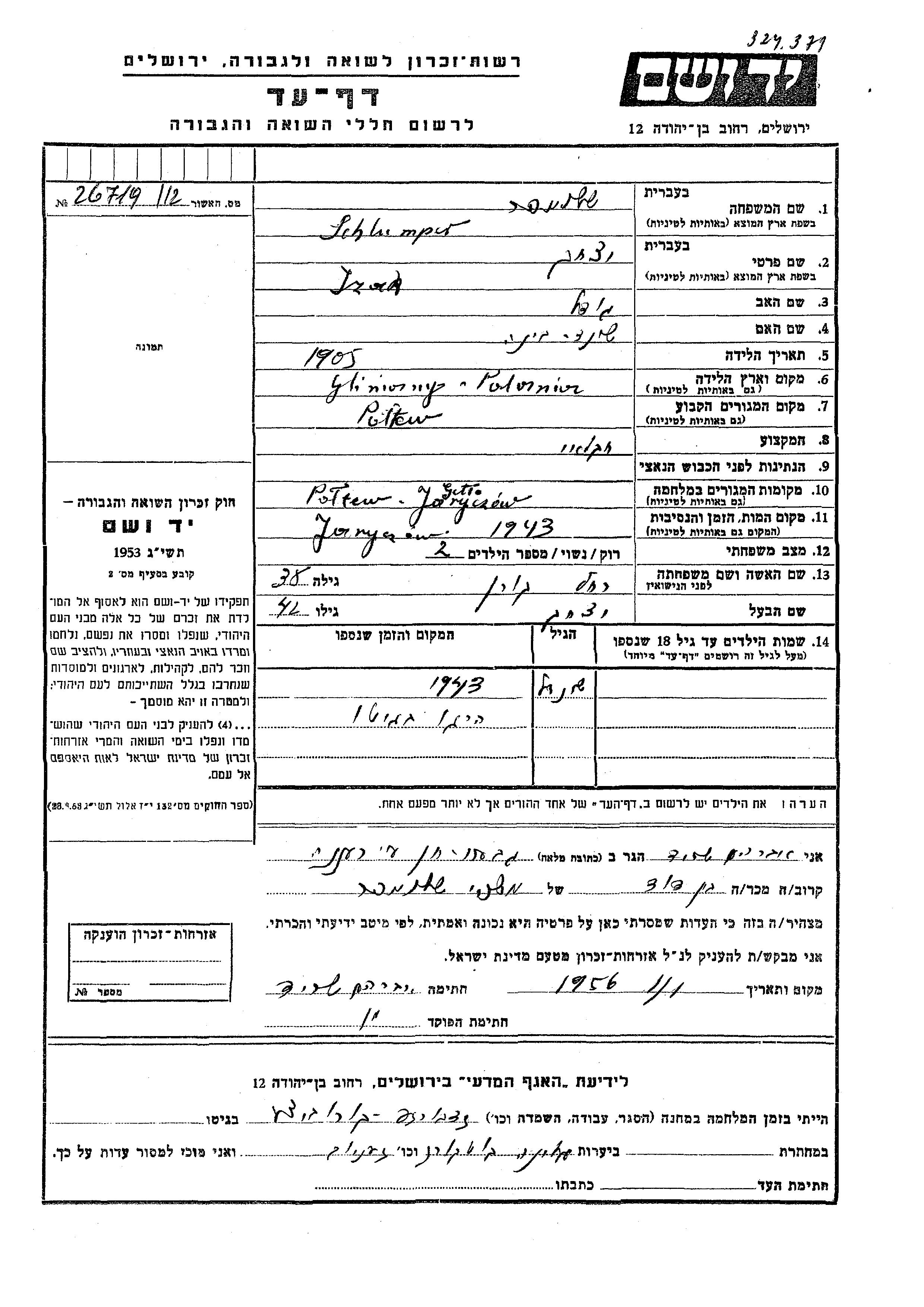 Sheindl Schlumper wurde Sie war die Tochter von Jzack und Rakhel, geb. Korn. Sie war Kind. Während des Krieges war sie in Jaryczow, Polen.