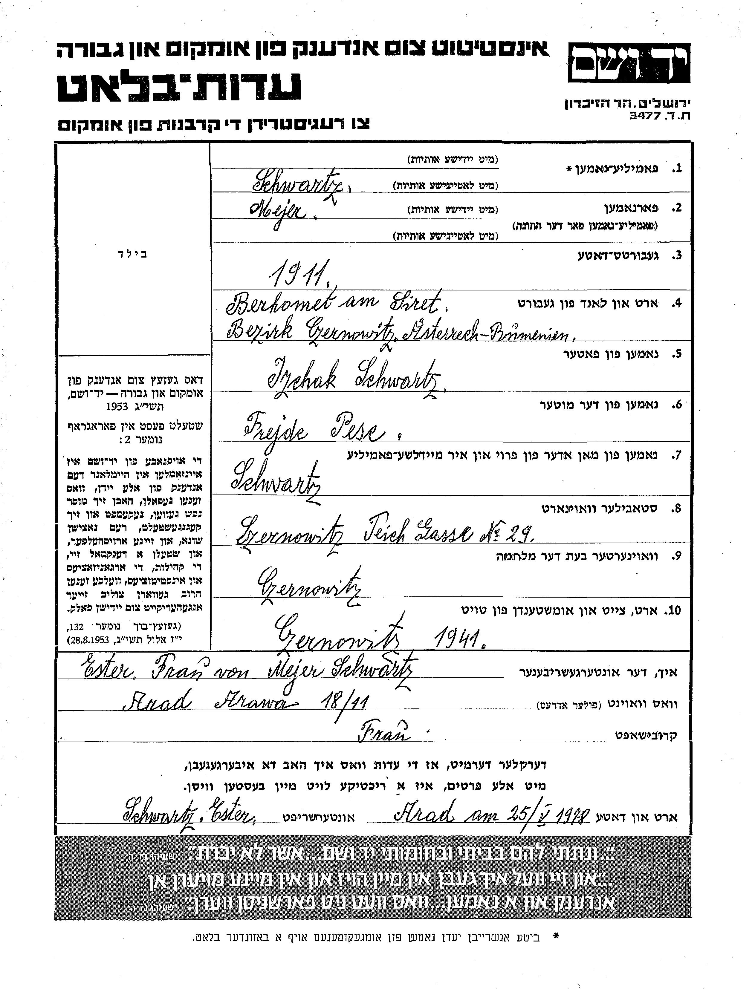 Mejer Schwartz wurde im Jahr 1911 in Berhomete pe Siret, Rumänien geboren. Er war der Sohn von Izchak und Frejde Pese. Vor dem Zweiten Weltkrieg lebte er in Czernowitz, Rumänien. Während des Krieges war er in Czernowitz, Rumänien.