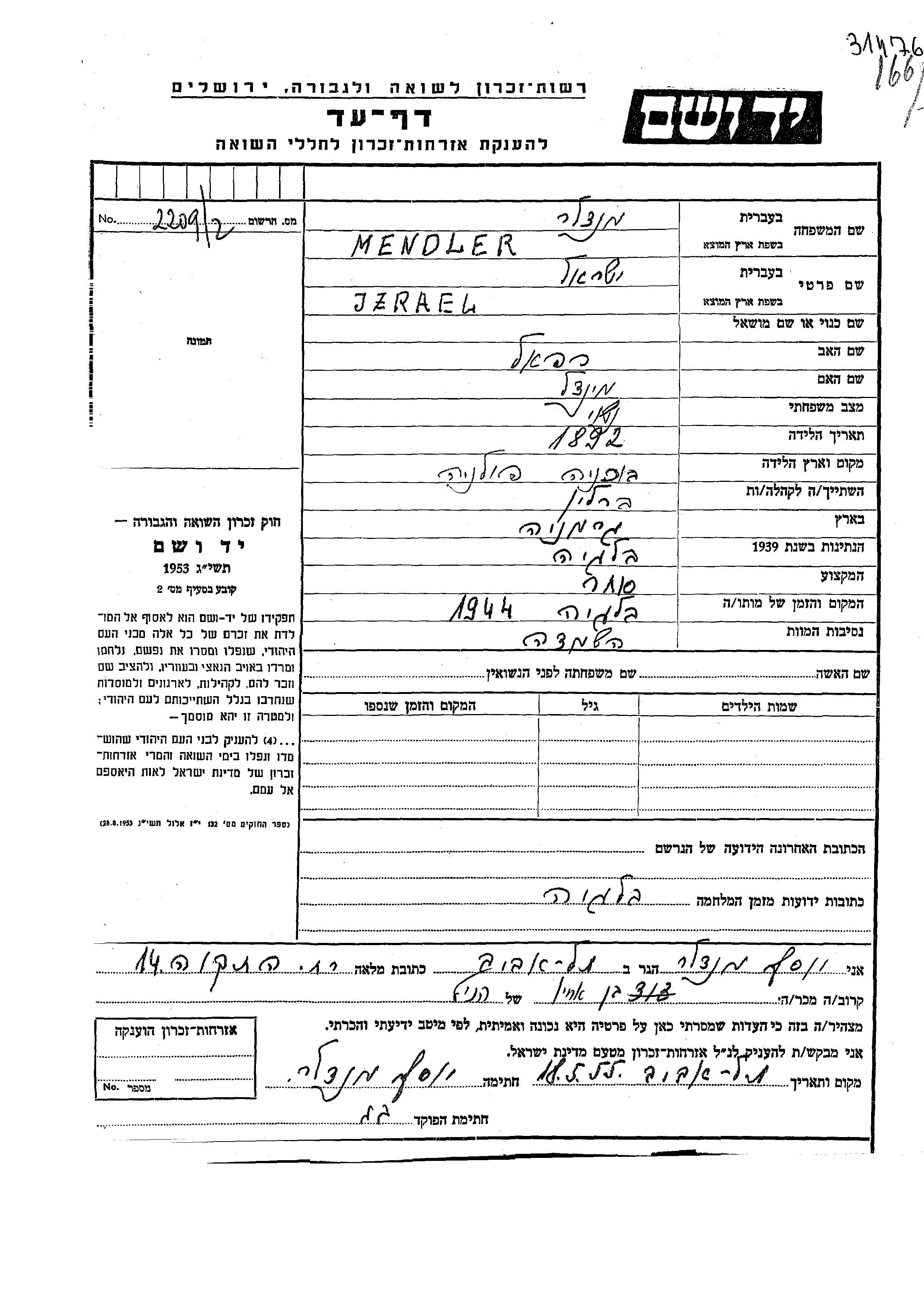 Izrael Mendler wurde im Jahr 1892 in Bochnia, Polen geboren. Er war der Sohn von Rafael und Mindl. Er war Kaufmann/-frau. Vor dem Zweiten Weltkrieg lebte er in Berlin, Deutsches Reich. Während des Krieges war er in Belgien.
