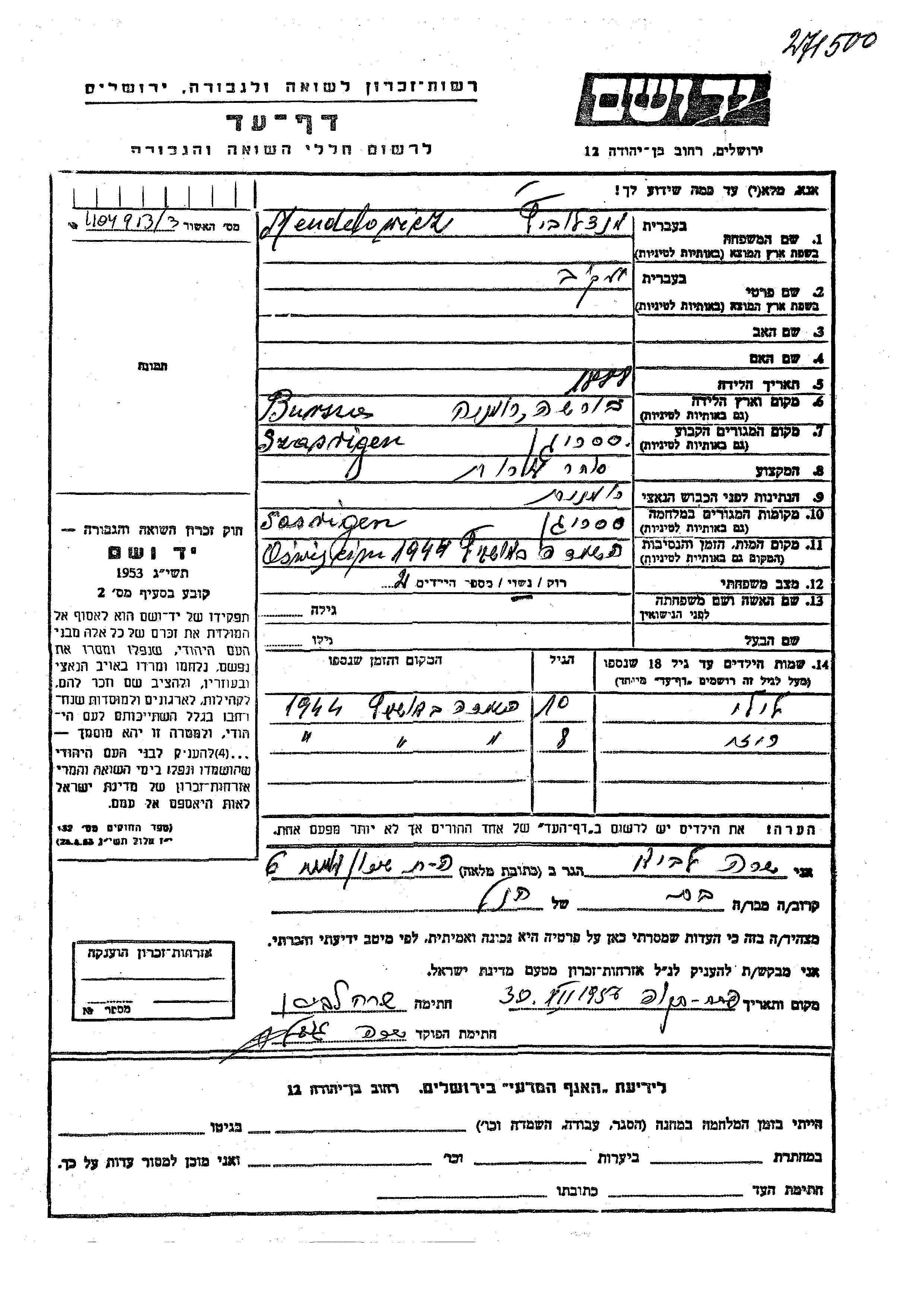 Yaakov Mendelowicz wurde im Jahr 1888 in Borsa, Rumänien geboren. Er war Lederhändler/-in und Verheiratet. Vor dem Zweiten Weltkrieg lebte er in Sasrigin, Rumänien. Während des Krieges war er in Sasrigin, Rumänien.