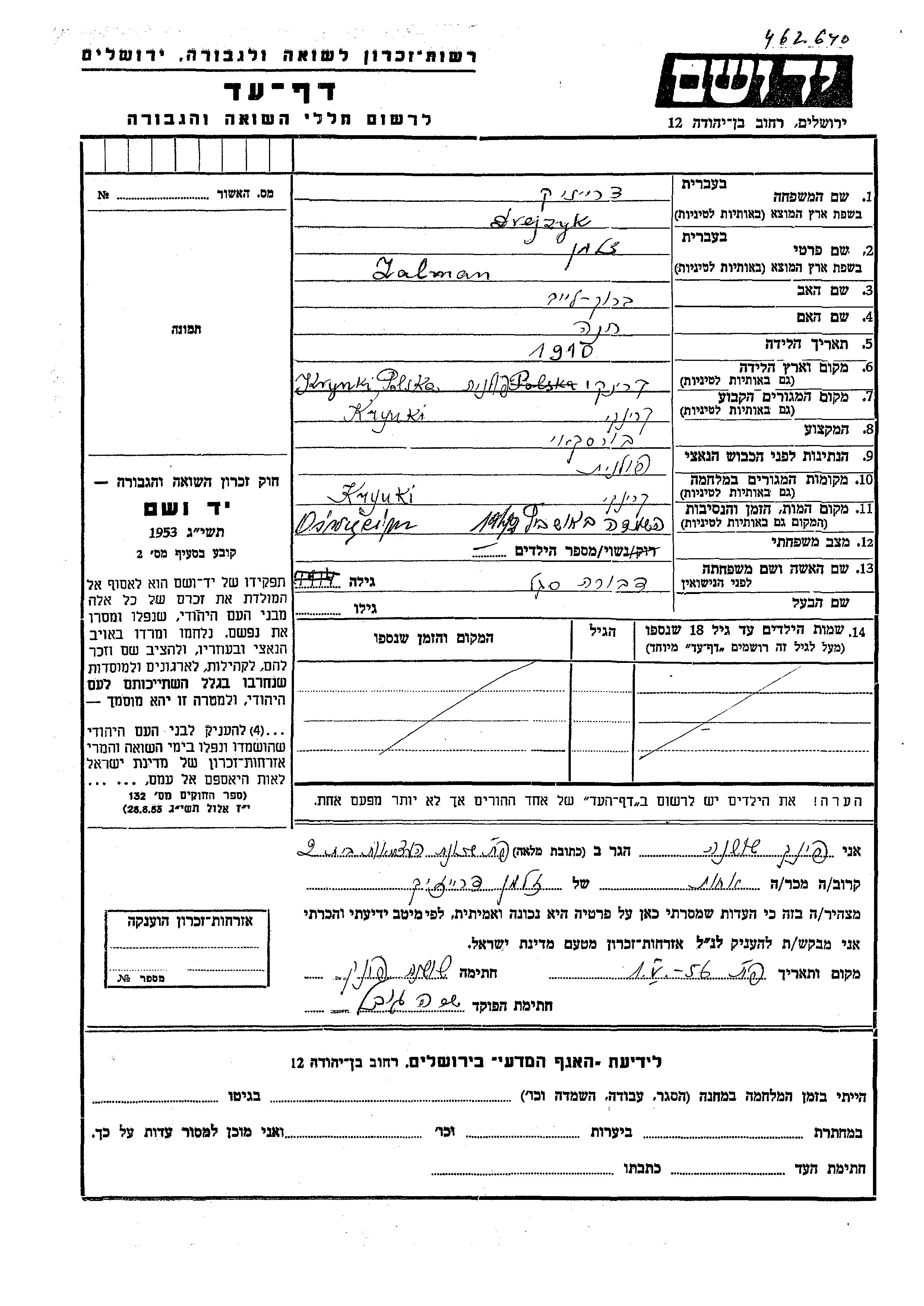 Zalman Drejzyk wurde im Jahr 1910 in Krynki, Polen geboren. Er war der Sohn von Barukh Leib und Khana. Er war Gerber und mit Dvora, geb. Segal Verheiratet. Vor dem Zweiten Weltkrieg lebte er in Krynki, Polen. Während des Krieges war er in Krynki, Polen.
