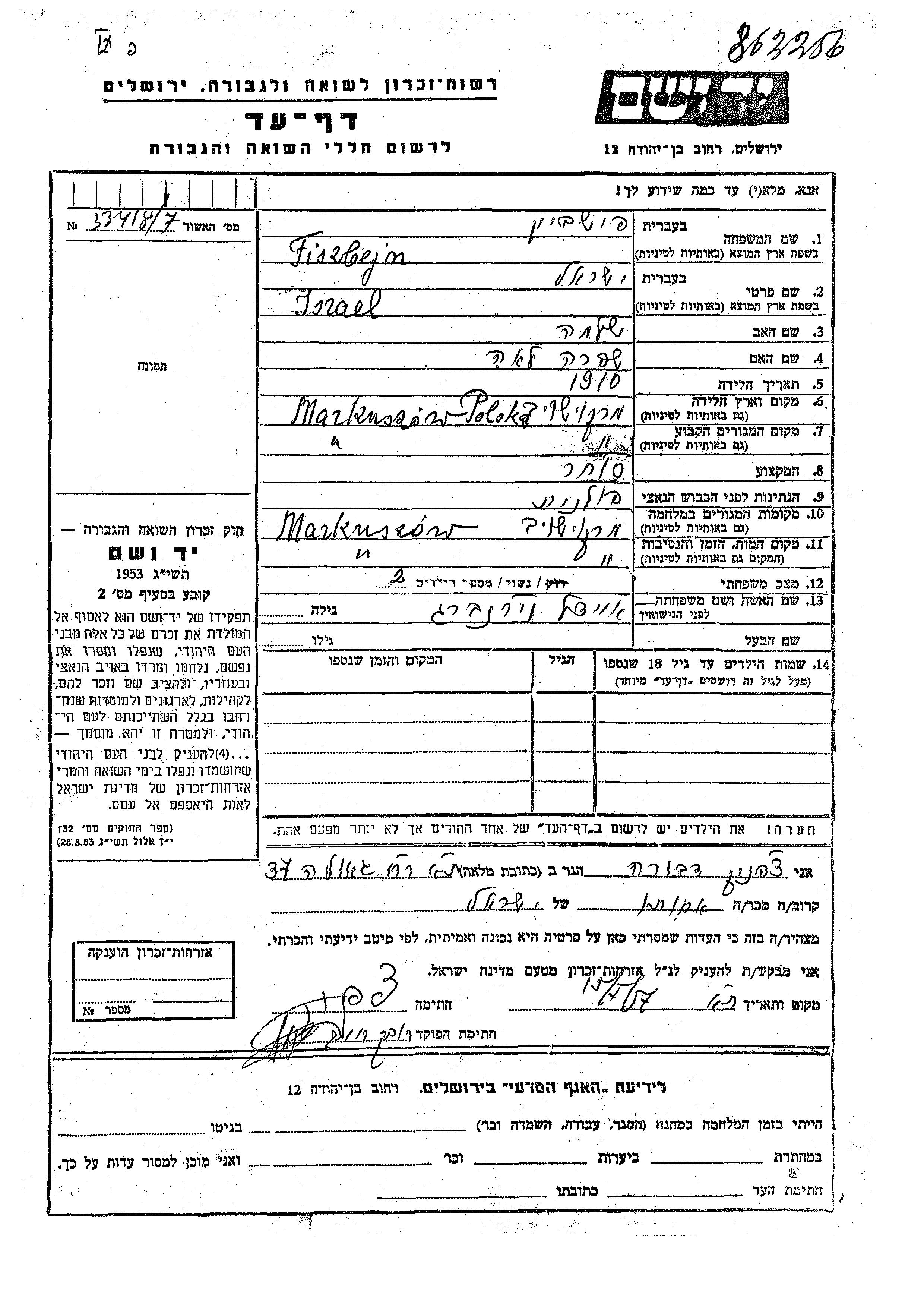 Israel Fiszbejn wurde im Jahr 1910 in Markuszow, Polen geboren. Er war der Sohn von Shlomo und Shifra Lea. Er war Kaufmann/-frau und mit Eidel, geb. Nirnberg Verheiratet. Vor dem Zweiten Weltkrieg lebte er in Markuszow, Polen. Während des Krieges war er in Markuszow, Polen.