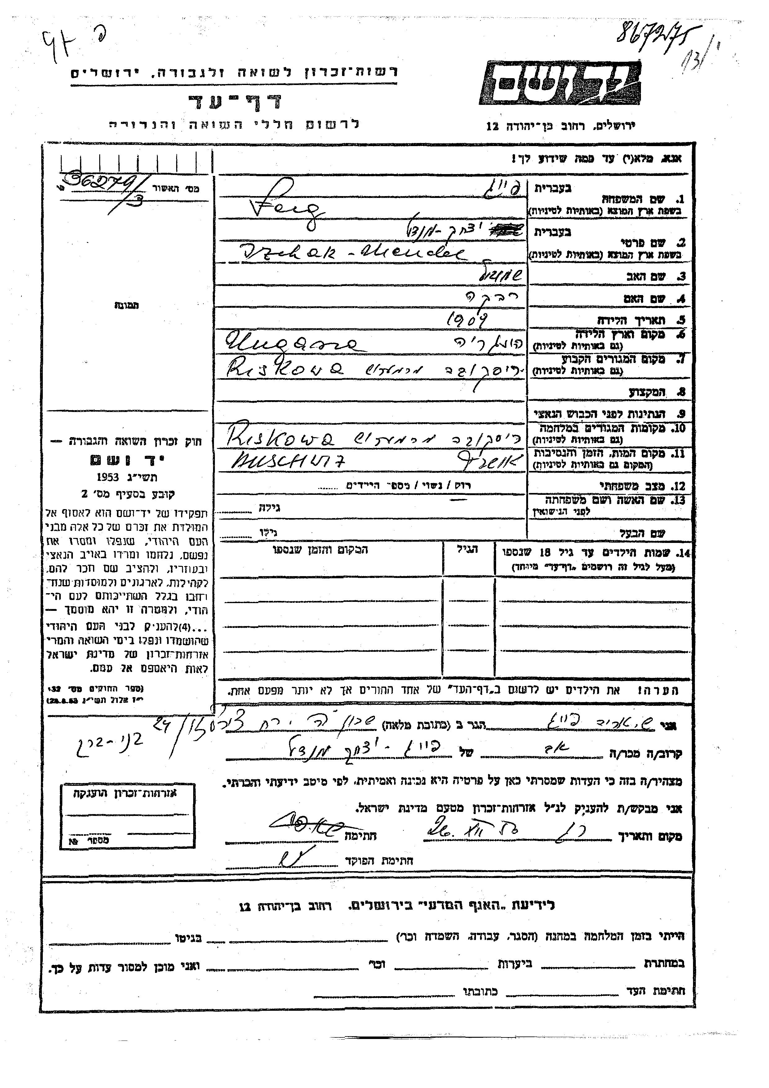 Feig Yzchak Mendel 1909 Riskova, Rumänien Gedenkblatt