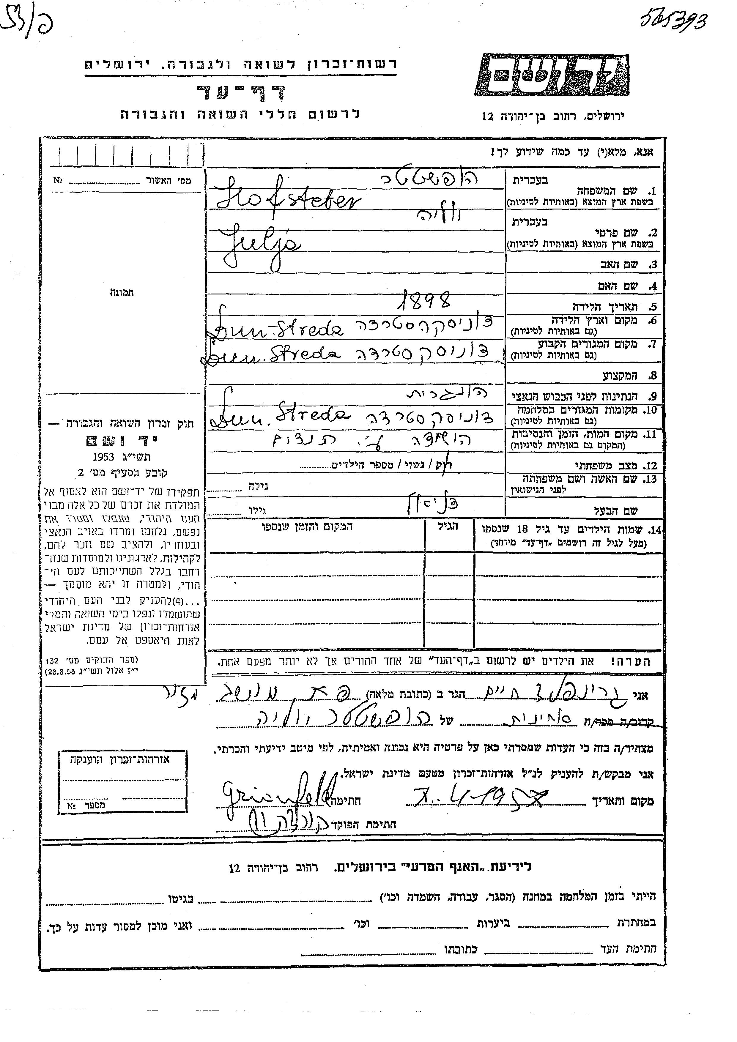 Yulja Hofsteter wurde im Jahr 1898 in Dun Streda, Tschechoslowakei geboren. Sie war mit Daniel Verheiratet. Vor dem Zweiten Weltkrieg lebte sie in Dun Streda, Tschechoslowakei. Während des Krieges war sie in Dun Streda, Tschechoslowakei.