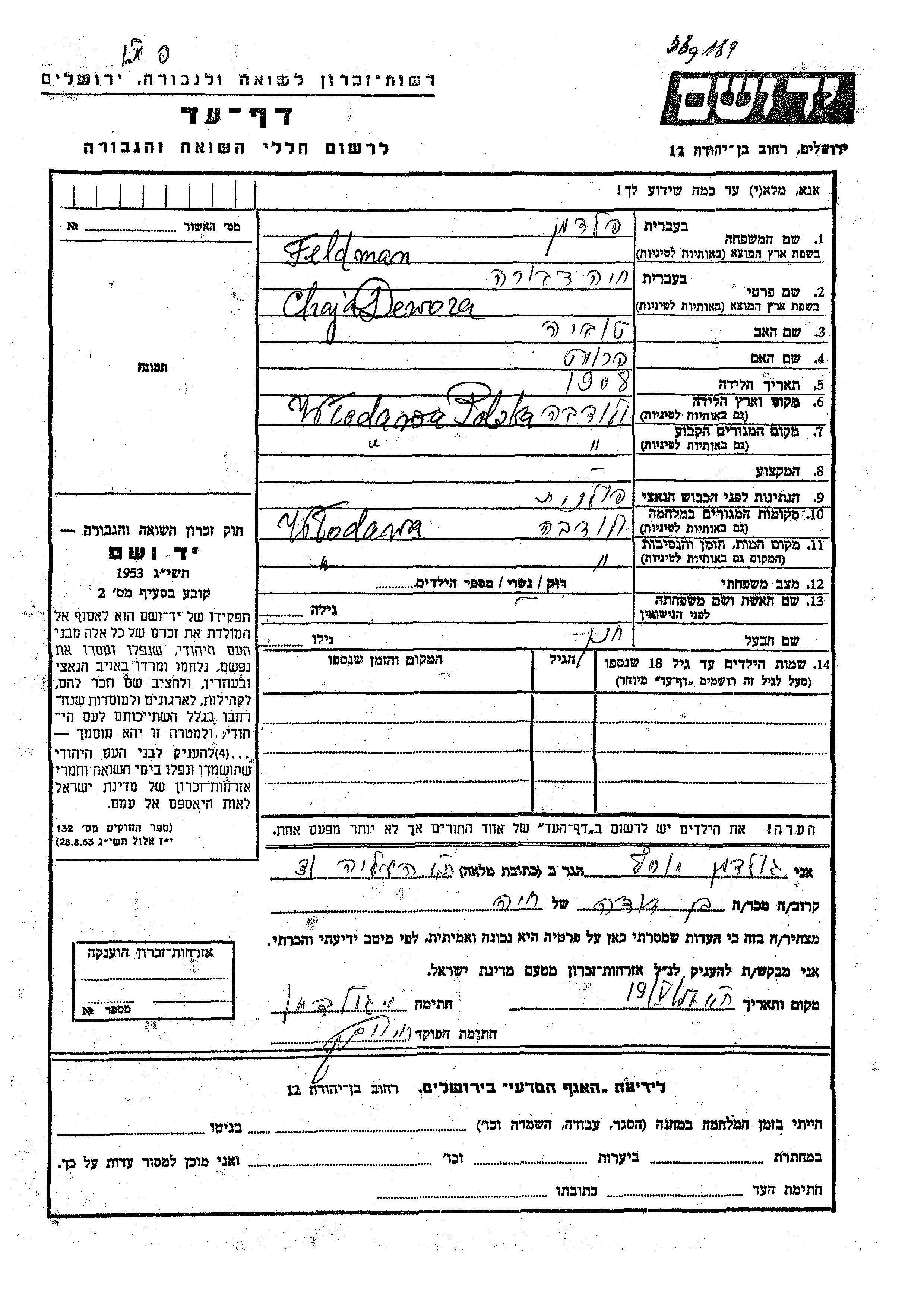Chaja Dewora Feldman wurde im Jahr 1908 in Wlodawa, Polen geboren. Sie war die Tochter von Tuvia und Frumet. Sie war mit Khanan Verheiratet. Vor dem Zweiten Weltkrieg lebte sie in Wlodawa, Polen. Während des Krieges war sie in Wlodawa, Polen.